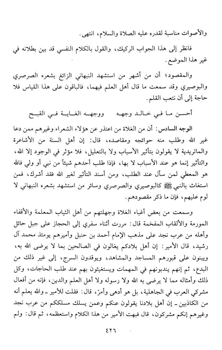 وسمعت من بعض أغباء الغلاة وجهلتهم من أهل الثياب المعلمة والأقفاء المورمة والألقاب المفخمة قال: مررت أثناء سفري إلى الحجاز على جبل حائل وأهله من عرب نجد على مذهب الإمام أحمد بن حنبل وأميرهم يومئذ محمد آل رشيد، قال الأمير: إن أهل بلادكم يغالون في الصالحين بما لا يرضى الله به، ويبنون على قبورهم المساجد والمشاهد، ويوقدون السرج، إلى غير ذلك من البدع، ثم إنهم يندبونهم في المهمات ويستغيثون بهم عند طلب الحاجات، وكل ذلك وأمثاله مما لا يرضى به الله ولا رسوله ولا أهل العلم والدين، فإنه من أفعال مشركى العرب في الجاهلية، بل هو أدهى وأمر، قال: فقلت للأمير- والله يعلم أنه من الكاذبين- إن أهل بلادنا يقولون عنكم وعمن يسلك مسلككم من عرب نجد وغيرهم إنكم مشركون، قال فبهت الأمير من هذا الكلام واستعظمه، ثم قال: ولم