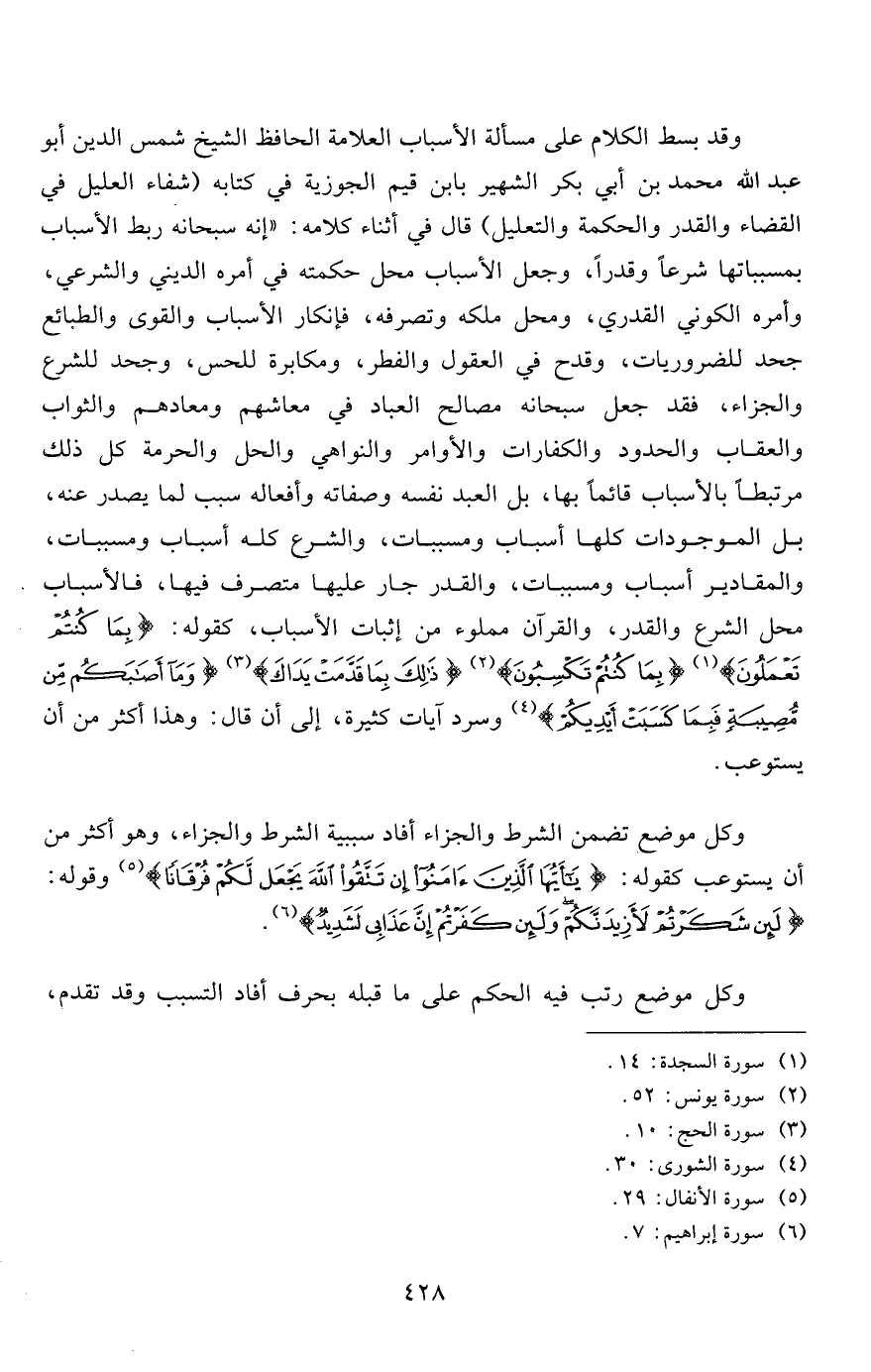 وقد بسط الكلام على مسألة الأسباب العلامة الحافظ الشيخ شمس الدين أبو عبد الله محمد بن أبي بكر الشهير بابن قيم الجوزية في كتابه (شفاء العليل في القضاء والقدر والحكمة والتعليل) قال في أثناء كلامه: "إنه سبحانه ربط الأسباب بمسبباتها شرعاً وقدراً، وجعل الأسباب محل حكمته في أمره الديني والشرعي، وأمره الكوني القدري، ومحل ملكه وتصرفه، فإنكار الأسباب والقوى والطبائع جحد للضروريات، وقدح في العقول والفطر، ومكابرة للحس، وجحد للشرع والجزاء، فقد جعل سبحانه مصالح العباد في معاشهم ومعادهم والثواب والعقاب والحدود والكفارات والأوامر والنواهي والحل والحرمة كل ذلك مرتبطاً بالأسباب قائماً بها، بل العبد نفسه وصفاته وأفعاله سبب لما يصدر عنه، بل الموجودات كلها أسباب ومسببات، والشرع كله أسباب ومسببات، والمقادير أسباب ومسببات، والقدر جار عليها متصرف فيها، فالأسباب محل الشرع والقدر، والقرآن مملوء من إثبات الأسباب، كقوله: {بِمَا كُنْتُمْ تَعْمَلُونَ} 1 {بِمَا كُنْتُمْ تَكْسِبُونَ} 2 {ذَلِكَ بِمَا قَدَّمَتْ يَدَاكَ} 3 {وَمَا أَصَابَكُمْ مِنْ مُصِيبَةٍ فَبِمَا كَسَبَتْ أَيْدِيكُمْ} 4 وسرد آيات كثيرة، إلى أن قال: وهذا أكثر من أن يستوعب.
