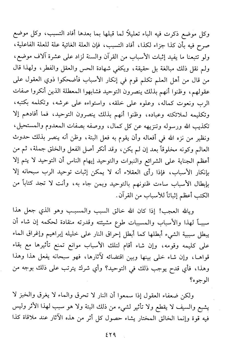 ويالله العجب! إذا كان الله خالق السبب والمسبب وهو الذي جعل هذا سبباً لهذا والأسباب والمسببات طوع مشيئته وقدرته منقادة لحكمه إن شاء أن يبطل سببية الشيء أبطلها كما أبطل إحراق النار على خليله إبراهيم وإغراق الماء على كليمه وقومه، وإن شاء أقام لتلك الأسباب موانع تمنع تأثيرها مع بقاء قواها، وإن شاء خلى بينها وبين اقتضائه لآثارها، فهو سبحانه يفعل هذا وهذا وهذا، فأي قدح يوجب ذلك في التوحيد؟ وأي شرك يترتب على ذلك بوجه من الوجوه؟
