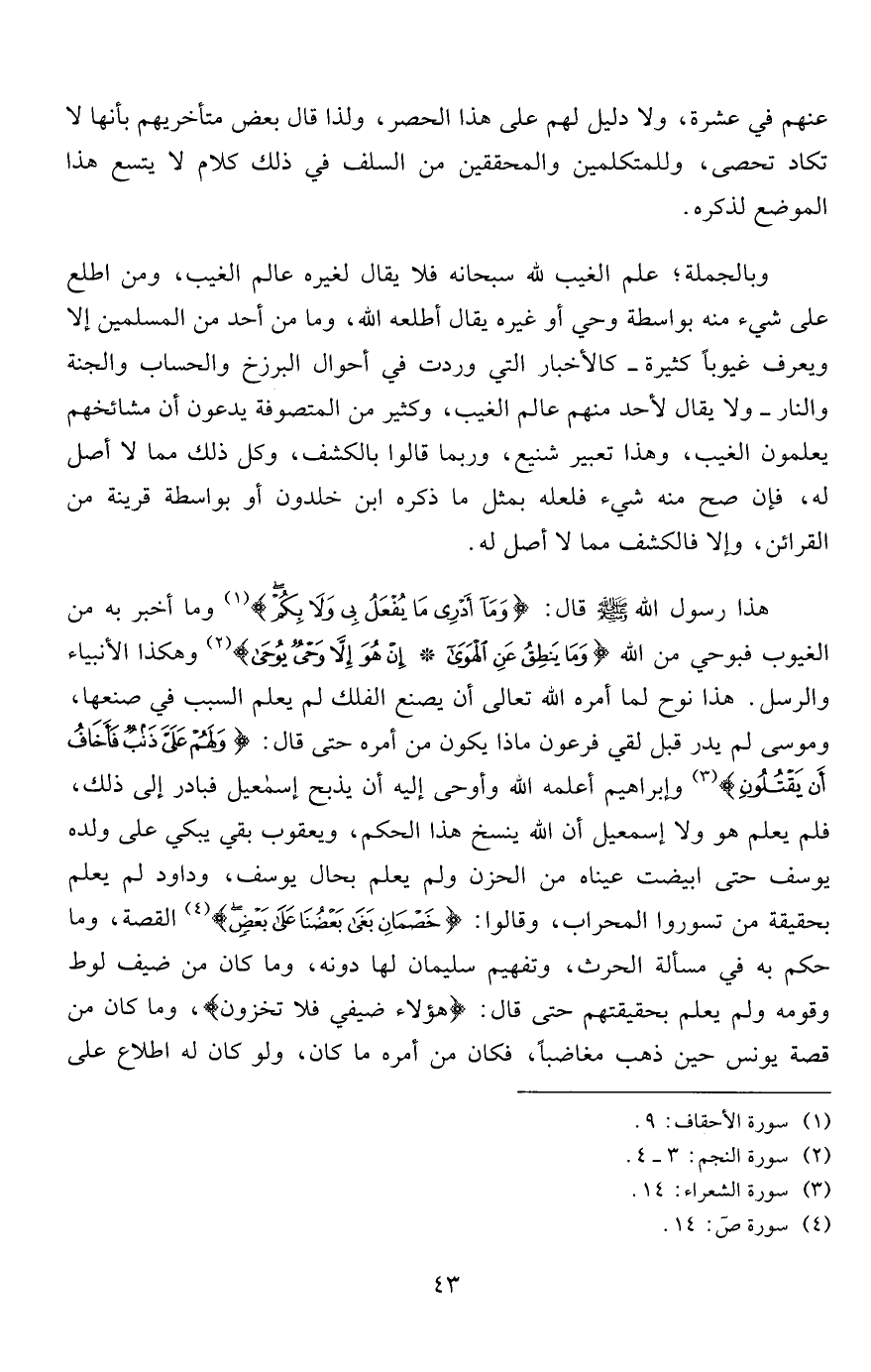 هذا رسول الله صلى الله عليه وسلم قال: {وَمَا أَدْرِي مَا يُفْعَلُ بِي وَلا بِكُمْ} 1 وما أخبر به من الغيوب فبوحي من الله {وَمَا يَنْطِقُ عَنِ الْهَوَى * إِنْ هُوَ إِلَّا وَحْيٌ يُوحَى} 2 وهكذا الأنبياء والرسل. هذا نوح لما أمره الله تعالى أن يصنع الفلك لم يعلم السبب في صنعها، وموسى لم يدر قبل لقي فرعون ماذا يكون من أمره حتى قال: {وَلَهُمْ عَلَيَّ ذَنْبٌ فَأَخَافُ أَنْ يَقْتُلُونِ} 3 وإبراهيم أعلمه الله وأوحى إليه أن يذبح إسماعيل فبادر إلى ذلك، فلم يعلم هو ولا إسماعيل أن الله ينسخ هذا الحكم، ويعقوب بقي يبكي على ولده يوسف حتى ابيضت عيناه من الحزن ولم يعلم بحال يوسف، وداود لم يعلم بحقيقة من تسوروا المحراب، وقالوا: {خَصْمَانِ بَغَى بَعْضُنَا عَلَى بَعْضٍ} 4 القصة، وما حكم به في مسألة الحرث، وتفهيم سليمان لها دونه، وما كان من ضيف لوط وقومه ولم يعلم بحقيقتهم حتى قال: {هؤلاء ضيفي فلا تخزون} ، وما كان من قصة يونس حين ذهب مغاضباً، فكان من أمره ما كان، ولو كان له إطلاع على