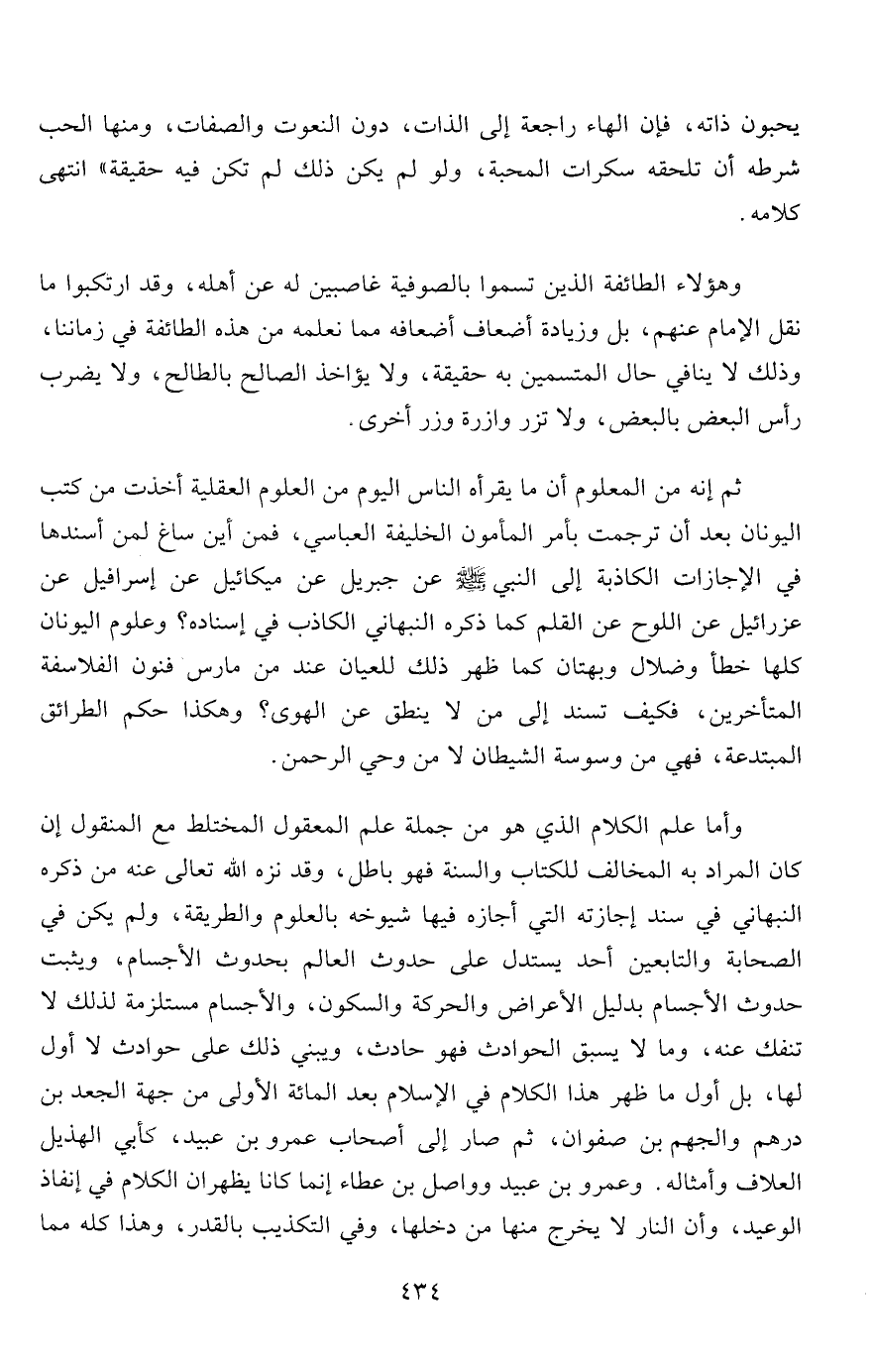 وأما علم الكلام الذي هو من جملة علم المعقول المختلط مع المنقول إن كان المراد به المخالف للكتاب والسنة فهو باطل، وقد نزه الله تعالى عنه من ذكره النبهاني في سند إجازته التي أجازه فيها شيوخه بالعلوم والطريقة، ولم يكن في الصحابة والتابعين أحد يستدل على حدوث العالم بحدوث الأجسام، ويثبت حدوث الأجسام بدليل الأعراض والحركة والسكون، والأجسام مستلزمة لذلك لا تنفك عنه، وما لا يسبق الحوادث فهو حادث، ويبني ذلك على حوادث لا أول لها، بل أول ما ظهر هذا الكلام في الإسلام بعد المائة الأولى من جهة الجعد بن درهم والجهم بن صفوان، ثم صار إلى أصحاب عمرو بن عبيد، كأبي الهذيل العلاف وأمثاله. وعمرو بن عبيد وواصل بن عطاء إنما كانا يظهران الكلام في إنفاذ الوعيد، وأن النار لا يخرج منها من دخلها، وفي التكذيب بالقدر، وهذا كله مما
