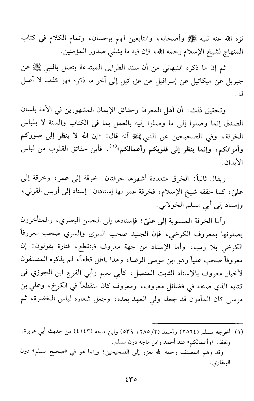 وتحقيق ذلك: أن أهل المعرفة وحقائق الإيمان المشهورين في الأمة بلسان الصدق إنما وصلوا إلى ما وصلوا إليه بالعمل بما في الكتاب والسنة لا بلباس الخرقة، وفي الصحيحين عن النبي صلى الله عليه وسلم أنه قال: "إن الله لا ينظر إلى صوركم وأموالكم، وإنما ينظر إلى قلوبكم وأعمالكم" 1. فأين حقائق القلوب من لباس الأبدان.