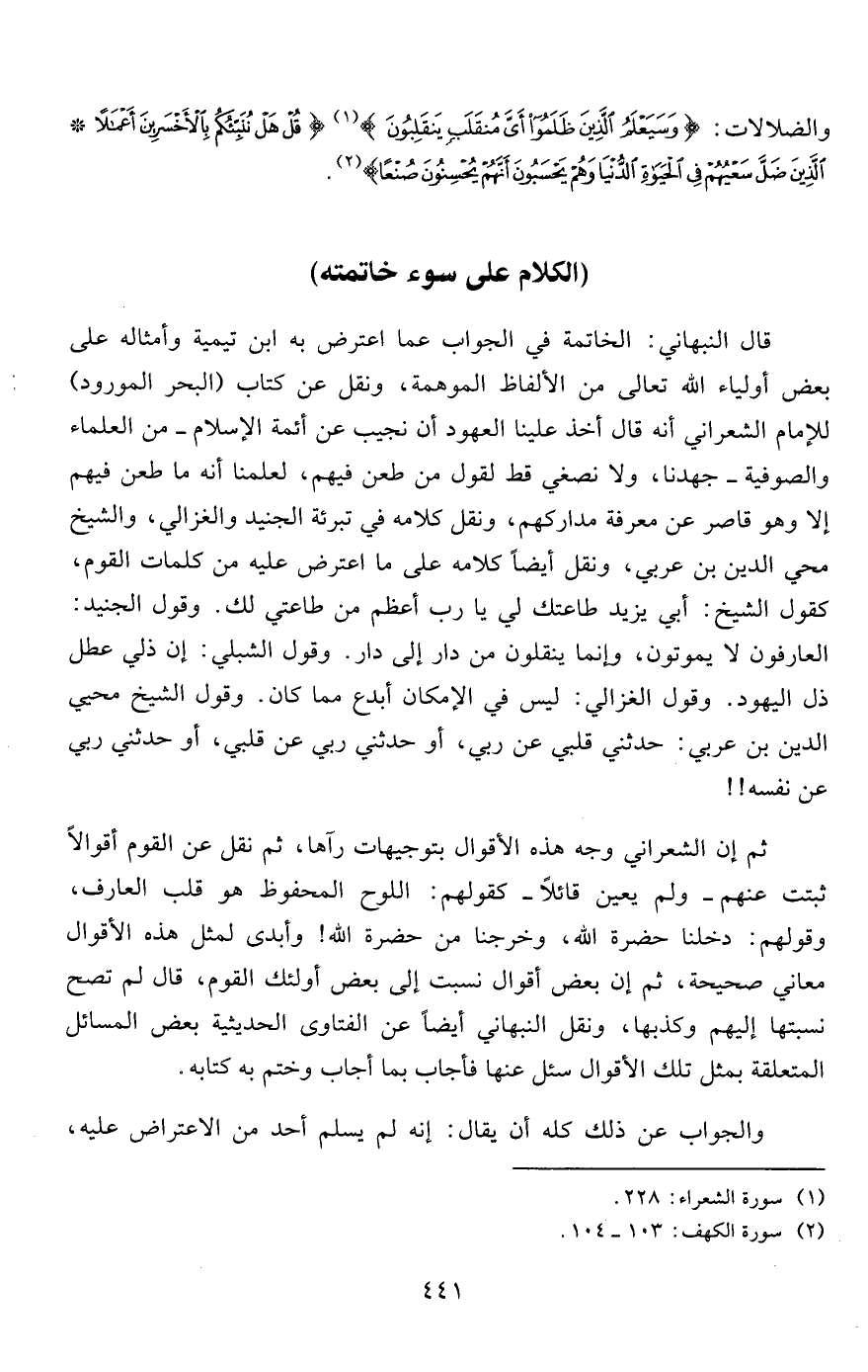 قال النبهاني: الخاتمة في الجواب عما اعترض به ابن تيمية وأمثاله على بعض أولياء الله تعالى من الألفاظ الموهمة، ونقل عن كتاب (البحر المورود) للإمام الشعراني أنه قال أخذ علينا العهود أن نجيب عن أئمة الإسلام- من العلماء والصوفية- جهدنا، ولا نصغي قط لقول من طعن فيهم، لعلمنا أنه ما طعن فيهم إلا وهو قاصر عن معرفة مداركهم، ونقل كلامه في تبرئة الجنيد والغزالي، والشيخ محيي الدين بن عربي، ونقل أيضاً كلامه على ما اعترض عليه من كلمات القوم، كقول الشيخ: أبي يزيد طاعتك لي يا رب أعظم من طاعتي لك. وقول الجنيد: العارفون لا يموتون، وإنما ينقلون من دار إلى دار. وقول الشبلي: إن ذلي عطل ذل اليهود. وقول الغزالي: ليس في الإمكان أبدع مما كان. وقول الشيخ محيي الدين بن عربي: حدثني قلبي عن ربي، أو حدثني ربي عن قلبي، أو حدثني ربي عن نفسه!!