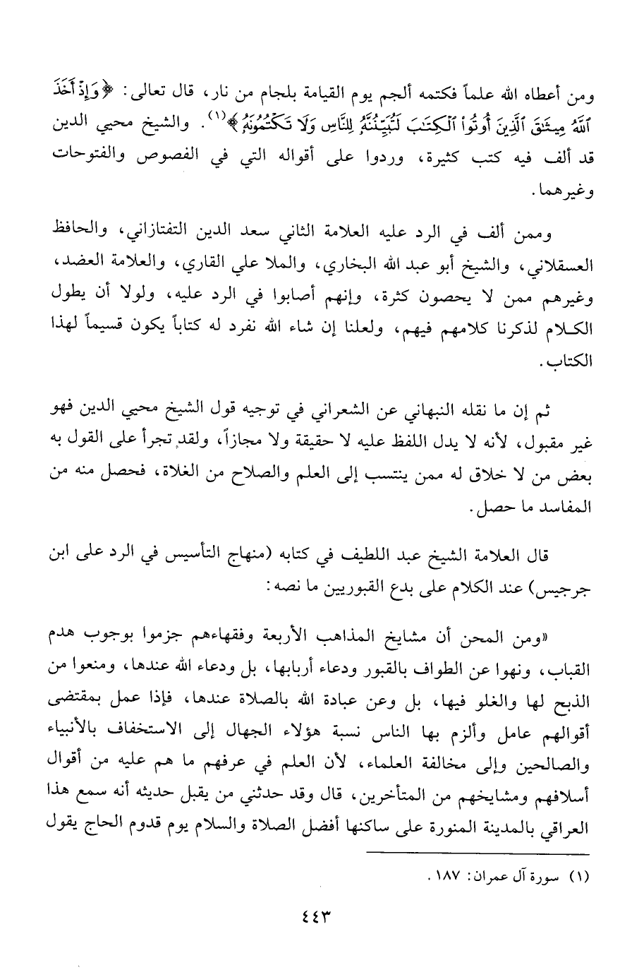 ومن أعطاه الله علماً فكتمه ألجم يوم القيامة بلجام من نار، قال تعالى {وَإِذْ أَخَذَ اللَّهُ مِيثَاقَ الَّذِينَ أُوتُوا الْكِتَابَ لَتُبَيِّنُنَّهُ لِلنَّاسِ وَلا تَكْتُمُونَهُ} 1. والشيخ محيي الدين قد ألف فيه كتب كثيرة، وردوا على أقواله التي في الفصوص والفتوحات وغيرهما.