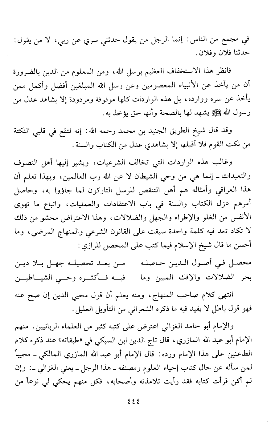 وغالب هذه الواردات التي تخالف الشرعيات، ويشير إليها أهل التصوف والتعبدات- إنما هي من وحي الشيطان لا عن الله رب العالمين، وبهذا تعلم أن هذا العراقي وأمثاله هم أهل التنقص للرسل التاركون لما جاؤوا به، وحاصل أمرهم عزل الكتاب والسنة في باب الاعتقادات والعمليات، واتباع ما تهوى الأنفس من الغلو والإطراء والجهل والضلالات، وهذا الاعتراض محشو من ذلك لا تكاد تعد فيه كلمة واحدة سيقت على القانون الشرعي والمنهاج المرضي، وما أحسن ما قال شيخ الإسلام فيما كتب على المحصل للرازي: