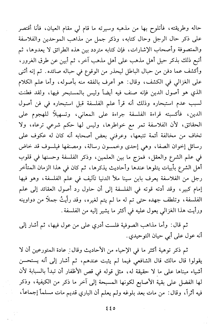 حاله وطريقته، فأتلوح بها من مذهبه وسيرته ما قام لي مقام العيان، فأنا أقتصر على ذكر حال الرجل وحال كتابه، وذكر جمل من مذاهب الموحدين والفلاسفة والمتصوفة وأصحاب الإشارات، فإن كتابه متردد بين هذه الطرائق لا يعدوها، ثم أتبع ذلك بذكر حيل أهل مذهب على أهل مذهب آخر، ثم أبين عن طرق الغرور، وأكشف عما دفن من حبال الباطل ليحذر من الوقوع في حباله صائده. ثم إنه أثنى على الغزالي في الكشف، وقال: هو أعرف بالفقه منه بأصوله، وأما علم الكلام الذي هو أصول الدين فإنه صنف فيه أيضاً وليس بالمستبحر فيها، ولقد فطنت لسبب عدم استبحاره وذلك أنه قرأ علم الفلسفة قبل استبحاره في فن أصول الدين، فأكسبته قراءة الفلسفة جراءة على المعاني، وتسهيلاً للهجوم على الحقائق، لأن الفلاسفة تمر مع خواطرها، وليس لها حكم شرعي ترعاه، ولا تخاف من مخالفة أئمة تتبعها، وعرفني بعض أصحابه أنه كان له عكوف على رسائل إخوان الصفا، وهي إحدى وخمسون رسالة، ومصنفها فيلسوف قد خاض في علم الشرع والعقل، فمزج ما بين العلمين، وذكر الفلسفة وحسنها في قلوب أهل الشرع بأبيات يتلوها عندها وأحاديث يذكرها، ثم كان في هذا الزمان المتأخر رجل من الفلاسفة يعرف بابن سينا ملأ الدنيا تآليف في علم الفلسفة، وهو فيها إمام كبير، وقد أدته قوته في الفلسفة إلى أن حاول رد أصول العقائد إلى علم الفلسفة، وتلطف جهده حتى تم له ما لم يتم لغيره، وقد رأيت جملاً من دواوينه ورأيت هذا الغزالي يعول عليه في أكثر ما يشير إليه من الفلسفة.