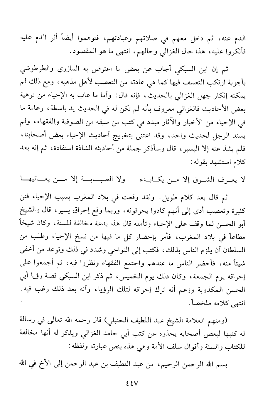 (ومنهم العلامة الشيخ عبد اللطيف الحنبلي) قال رحمه الله تعالى في رسالة له كتبها لبعض أصحابه يحذره عن كتب أبي حامد الغزالي ويذكر له أنها مخالفة للكتاب والسنة وأقوال سلف الأمة وهي هذه بنص عبارته ولفظه: