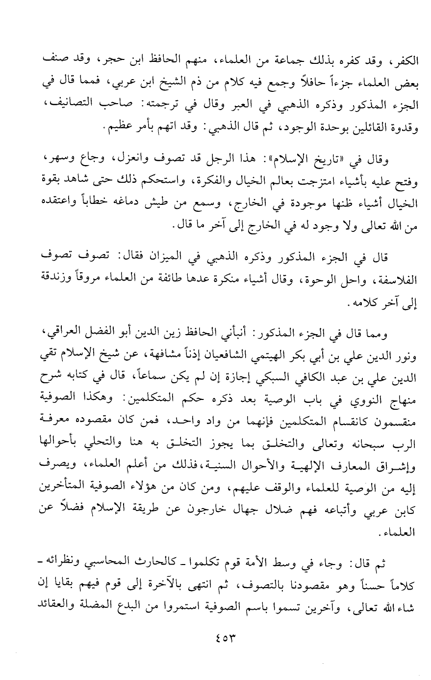 ومما قال في الجزء المذكور: أنبأني الحافظ زين الدين أبو الفضل العراقي، ونور الدين علي بن أبي بكر الهيتمي الشافعيان إذناً مشافهة، عن شيخ الإسلام تقي الدين علي بن عبد الكافي السبكي إجازة إن لم يكن سماعاً، قال في كتابه شرح منهاج النووي في باب الوصية بعد ذكره حكم المتكلمين: وهكذا الصوفية منقسمون كانقسام المتكلمين فإنهما من واد واحد، فمن كان مقصوده معرفة الرب سبحانه وتعالى والتخلق بما يجوز المخلق به هنا والتحلي بأحوالها وإشراق المعارف الإلهية والأحوال السنية، فذلك من أعلم العلماء، ويصرف إليه من الوصية للعلماء والوقف عليهم، ومن كان من هؤلاء الصوفية المتأخرين كابن عربي وأوتباعه فهم ضلال جهال خارجون عن طريقة الإسلام فضلاً عن العلماء.