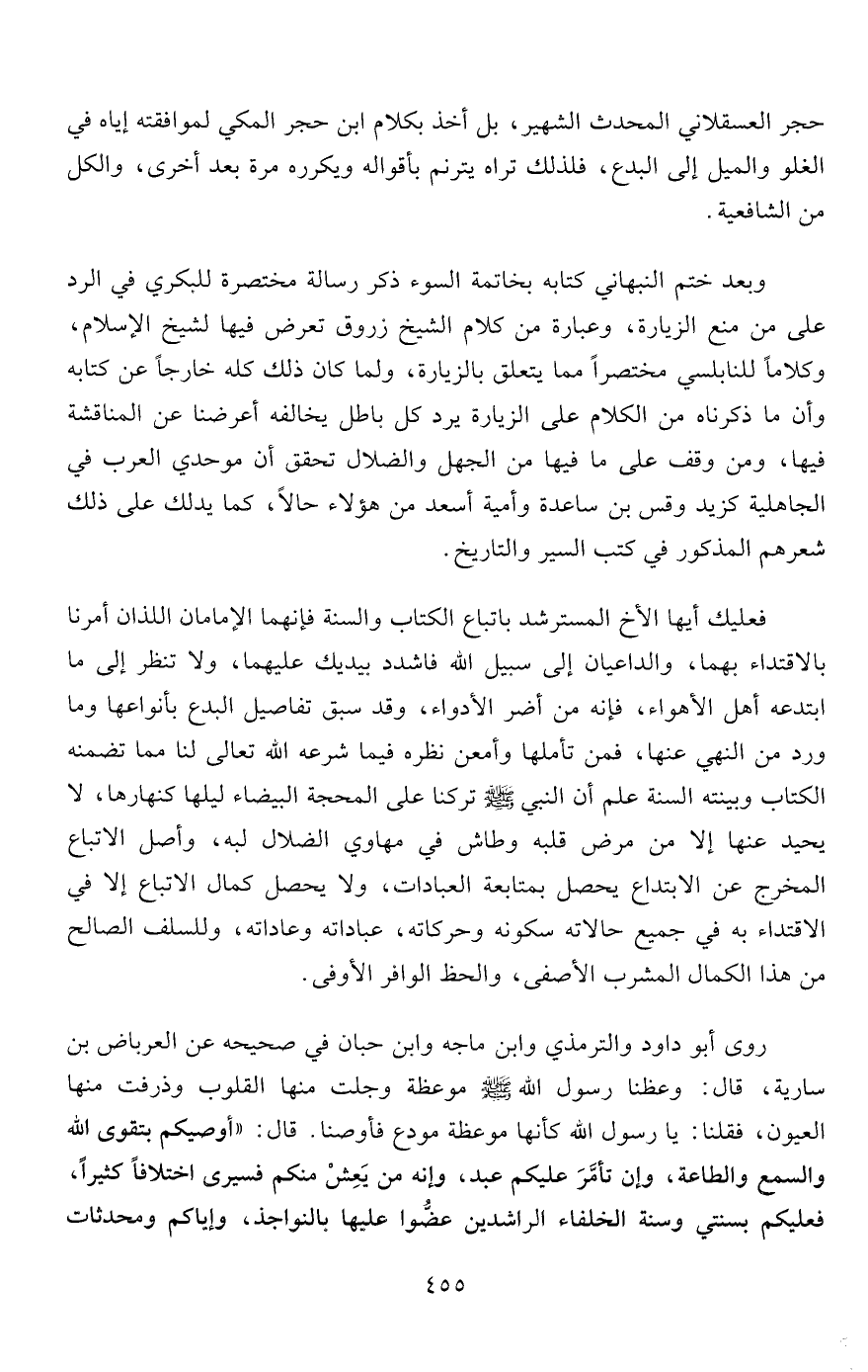 وبعد ختم النبهاني كتابه بخاتمة السوء ذكر رسالة مختصرة للبكري في الرد على من منع الزيارة، وعبارة من كلام الشيخ زروق تعرض فيها لشيخ الإسلام، وكلاماً للنابلسي مختصراً مما يتعلق بالزيارة، ولما كان ذلك كله خارجاً عن كتابه وأن ما ذكرناه من الكلام على الزيارة يرد كل باطل يخالفه أعرضنا عن المناقشة فيها، ومن وقف على ما فيها من الجهل والضلال تحقق أن موحدي العرب في الجاهلية كزيد وقس بن ساعدة وأمية أسعد من هؤلاء حالاً، كما يدلك على ذلك شعرهم المذكور في كتب السير والتاريخ.