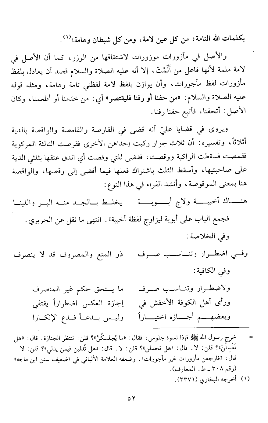 والأصل فتي مأزورات موزورات لاشتقاقها من الوزر، كما أن الأصل في لامة ملمة لأنها فاعل من أَلَمَّتْ، إلا أنه عليه الصلاة والسلام قصد أن يعادل بلفظ مأزورات لفظ مأجورات، وأن يوازن بلفظ لامة لفظتي تامة وهامة، ومثله قوله عليه الصلاة والسلام: "من حفنا أو رفنا فليقتصر" أي: من خدمنا أو أطعمنا، وكان الأصل: أتحفنا، فأتبع حفنا رفنا.
