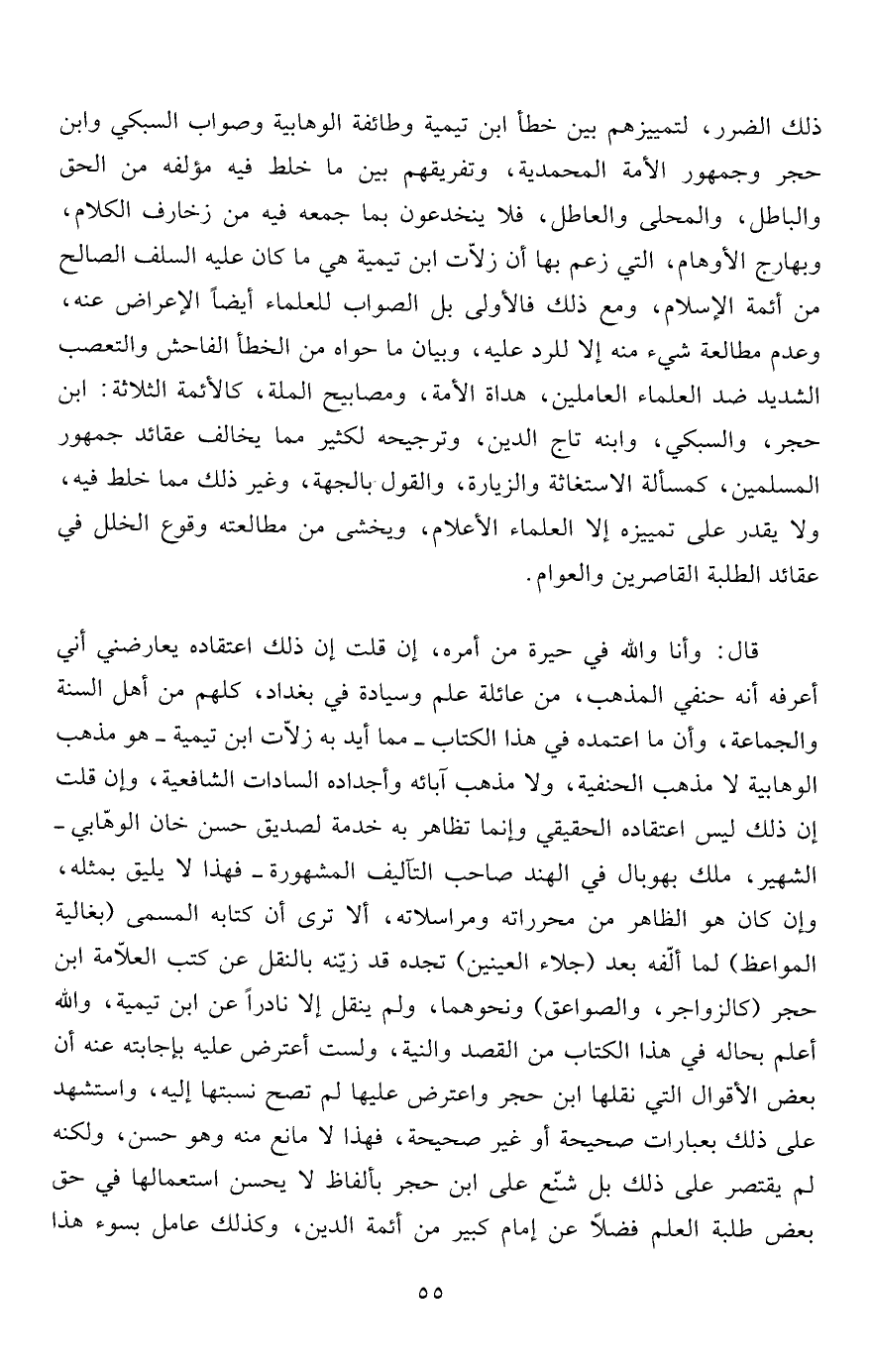 ذلك الضرر، لتمييزهم بين خطأ ابن تيمية وطائفة الوهابية وصواب السبكي وابن حجر وجمهور الأمة المحمدية، وتفريقهم بين ما خلط فيه مؤلفه من الحق والباطل، والمحلى والعاطل، فلا ينخدعون بما جمعه فيه من زخارف الكلام، وبهارج الأوهام، التي زعم بها أن زلاّت ابن تيمية هي ما كان عليه السلف الصالح من أئمة الإسلام، ومع ذلك فالأولى بل الصواب للعلماء أيضاً الإعراض عنه، وعدم مطالعة شيء منه إلا للرد عليه، وبيان ما حواه من الخطأ الفاحش والتعصب الشديد ضد العلماء العاملين، هداة الأمة، ومصابيح الملة، كالأئمة الثلاثة: ابن حجر، والسبكي، وابنه تاج الدين وترجيحه لكثير مما يخالف عقائد بجمهور المسلمين، كمسألة الاستغاثة والزيارة، والقول بالجهة، وغير ذلك مما خلط فيه، ولا يقدر على تمييزه إلا العلماء الأعلام، ويخشى من مطالعته وقوع الخلل في عقائد الطلبة القاصرين والعوام.