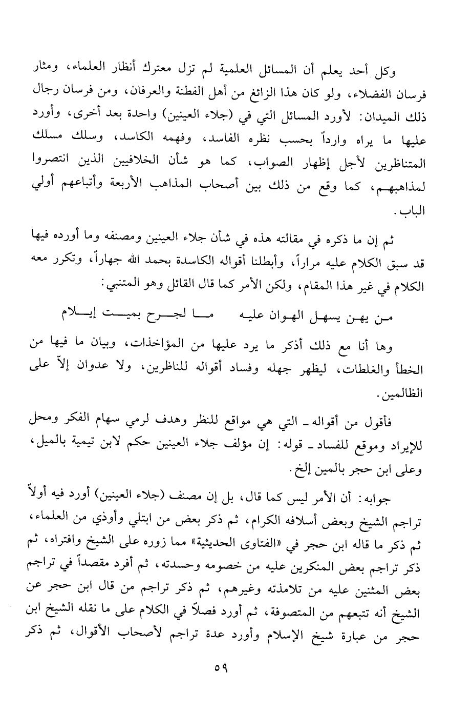 وكل أحد يعلم أن المسائل العلمية لم تزل معترك أنظار العلماء، ومثار فرسان الفضلاء، ولو كان هذا الزائغ من أهل الفطنة والعرفان، ومن فرسان رجال ذلك الميدان: لأورد المسائل التي في "جلاء العينين" واحدة بعد أخرى، وأورد عليها ما يراه وارداً بحسب نظره الفاسد، وفهمه الكاسد، وسلك مسلك والمتناظرين لأجل إظهار الصواب، كما هو شأن الخلافيين الذين انتصروا لمذاهبهم، كما وقع من ذلك بين أصحاب المذاهب الأربعة وأتباعهم أولي الباب.