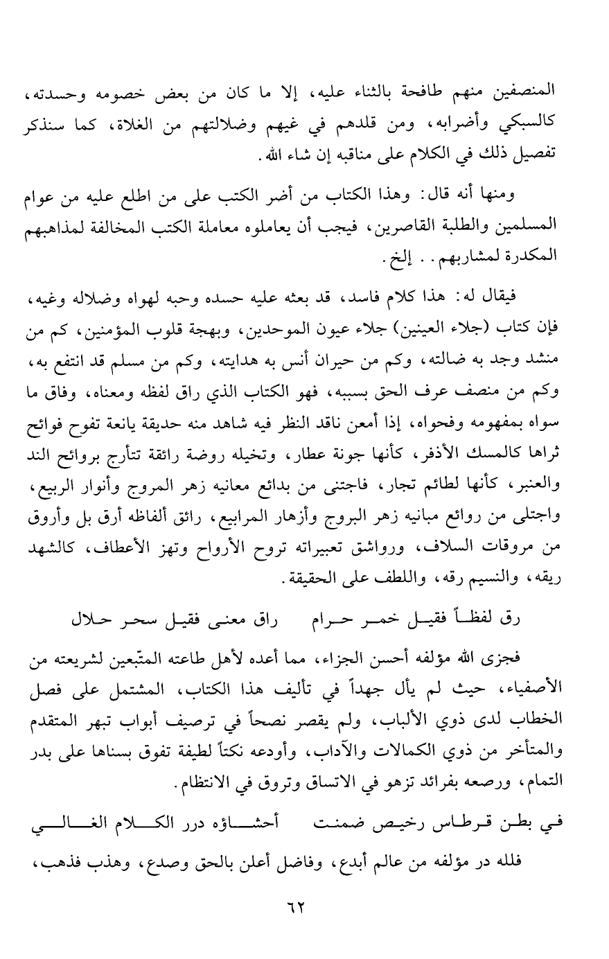 فجزى الله مؤلفه أحسن الجزاء، مما أعده لأهل طاعته المتّبعين لشريعته من الأصفياء، حيث لم يأل جهداً في تأليف هذا الكتاب، المشتمل على فصل الخطاب لدى ذوي الألباب، ولم يقصر نصحاً في ترصيف أبواب تبهر المتقدم والمتأخر من ذوي الكمالات والآداب، وأودعه نكتاً لطيفة تفوق بسناها على بدر التمام، ورصعه بفرائد تزهو في الاتساف وتروق في الانتظام.