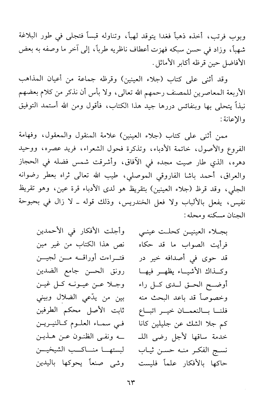 ممن أثنى على كتاب "جلاء العينين" علامة المنقول والمعقول، وفهامة الفروع والأصول، خاتمة الأدباء، وتذكرة فحول الشعراء، فريد عصره، ووحيد دهره، الذي طار صيت مجده في الآفاق، وأشرقت شمس فضله في الحجاز والعراق، أحمد باشا الفاروقي الموصلي، طيب الله تعالى ثراه بعطر رضوانه الجلي، وقد قرظ "جلاء العينين" بتقريظ هو لدى الأدباء قرة عين، وهو تقريظ نفيس، يفعل بالألباب ولا فعل الخندريس، وذلك قوله- لا زال في بحبوحة الجنان مسكنه ومحله: