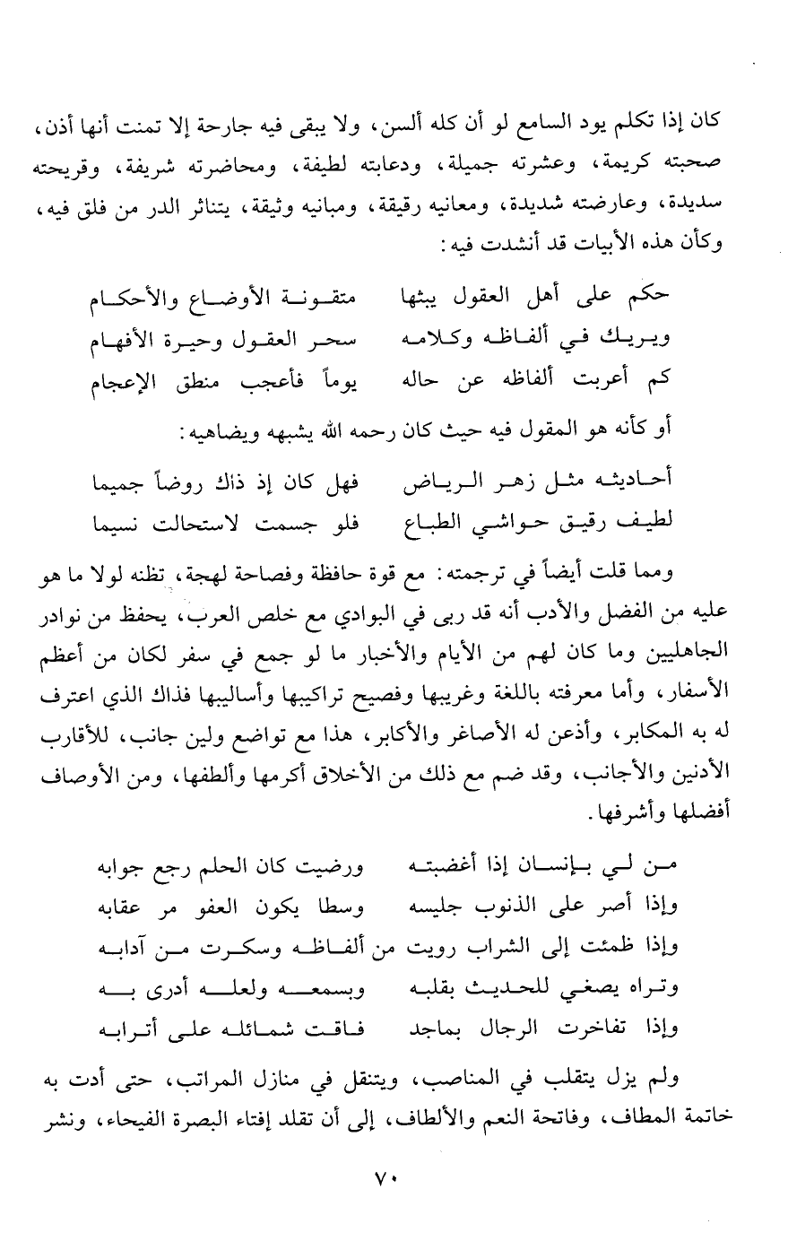 مما قلت أيضاً في ترجمته: مع قوة حافظة وفصاحة لهجة، تظنه لولا ما هو عليه من الفضل والأدب أنه قد ربى في البوادي مع خلص العرب، يحفظ من نوادر الجاهليين وما كان لهم من الأيام والأخبار ما لو جمع في سفر لكان من أعظم الأسفار، وأما معرفته باللغة وغريبها وفصيح تراكيبها وأساليبها فذاك الذي اعترف له به المكابر، وأذعن له الأصاغر والأكابر، هذا مع تواضع ولين جانب، للأقارب الأدنين والأجانب، وقد ضم مع ذلك من الأخلاق أكرمها وألطفها، ومن الأوصاف أفضلها وأشرفها.