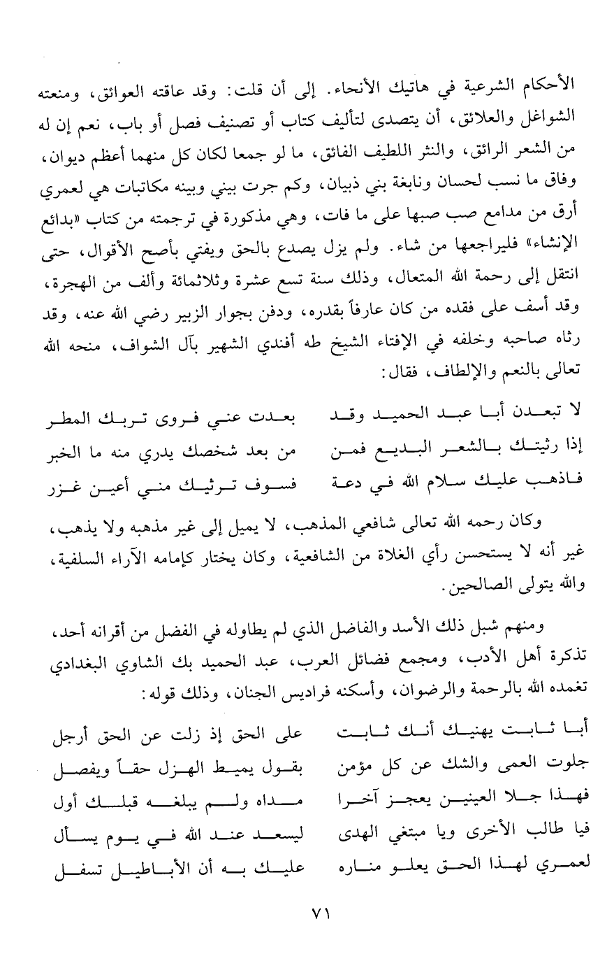 الأحكام الشرعية في هاتيك الأنحاء. إلى أن قلت: وقد عاقته العوائق، ومنعته الشواغل والعلائق، أن يتصدى لتأليف كتاب أو تصنيف فصل أو باب، نعم إن له من الشعر الرائق، والنثر اللطيف الفائق، ما لو جمعا لكان كل منهما أعظم ديوان، وفاق ما نسب لحسان ونابغة بني ذبيان، وكم جرت بيني وبينه مكاتبات هي لعمري أرق من مدامع صب صبها على ما فات، وهي مذكورة في ترجمته من كتاب "بدائع الإنشاء" فليراجعها من شاء. ولم يزل يصدع بالحق ويفتي بأصح الأقوال، حتى انتقل إلى رحمة الله المتعال، وذلك سنة تسع عشرة وثلاثمائة وألف من الهجرة، وقد أسف على فقده من كان عارفاً بقدره، ودفن بجوار الزبير رضي الله عنه، وقد رثاه صاحبه وخلفه في الإفتاء الشيخ طه أفندي الشهير بآل الشواف، منحه الله تعالى بالنعم والإلطاف، فقال: