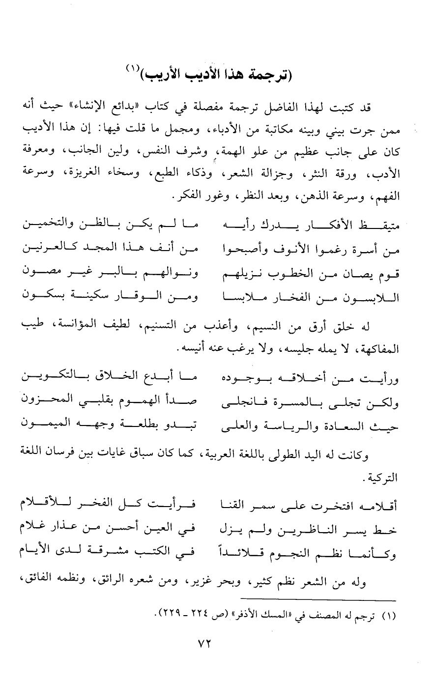 قد كتبت لهذا الفاضل ترجمة مفصلة في كتاب "بدائع الإنشاء" حيث أنه ممن جرت بيني وبينه مكاتبة من الأدباء، ومجمل ما قلت فيها: إن هذا الأديب كان على جانب عظيم من علو الهمة، وشرف النفس، ولين الجانب، ومعرفة الأدب، ورقة النثر، وجزالة الشعر، وذكاء الطبع، وسخاء الغريزة، وسرعة الفهم، وسرعة الذهن، وبعد النظر، وغور الفكر.