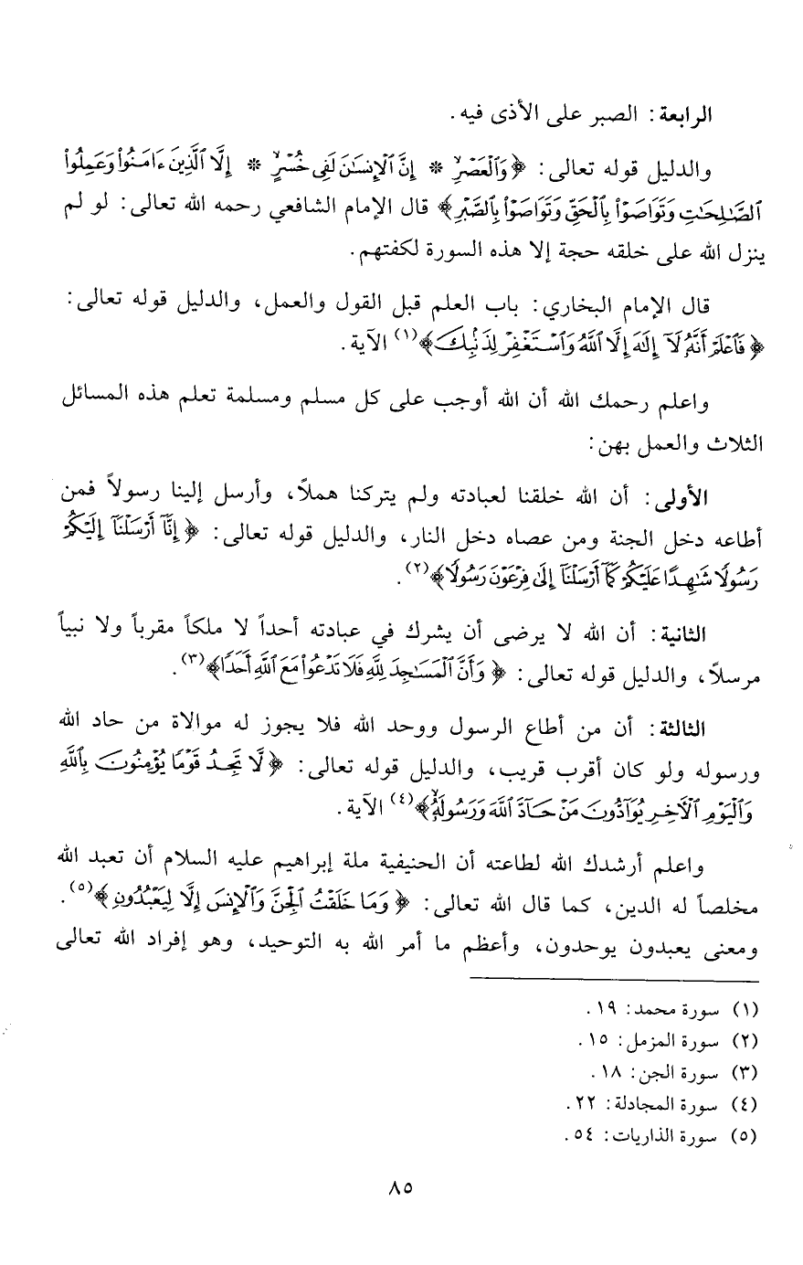 الثالثة: أن من أطاع الرسول ووحد الله فلا يجوز له موالاة من حاذ الله ورسوله ولو كان أقرب قريب، والدليل قوله تعالى: {لا تَجِدُ قَوْماً يُؤْمِنُونَ بِاللَّهِ وَالْيَوْمِ الْآخِرِ يُوَادُّونَ مَنْ حَادَّ اللَّهَ وَرَسُولَهُ} 4 الآية. وعلم أرشدك الله لطاعته أن الحنيفية ملة إبراهيم عليه السلام أن تعبد الله مخلصاً له الدين، كما قال الله تعالى: {وَمَا خَلَقْتُ الْجِنَّ وَالْأِنْسَ إِلَّا لِيَعْبُدُونِ} 5. ومعنى يعبدون يوحدون، وأعظم ما أمر الله به التوحيد، وهو إفراد الله تعالى