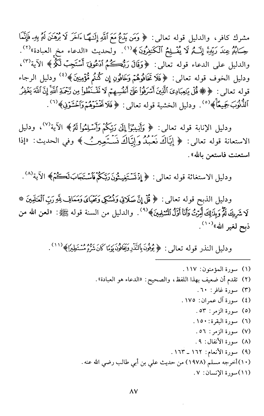 ودليل الاستغاثة قوله تعالى: {إِذْ تَسْتَغِيثُونَ رَبَّكُمْ فَاسْتَجَابَ لَكُمْ} الآية8. ودليل الذبح قوله تعالى: {قُلْ إِنَّ صَلاتِي وَنُسُكِي وَمَحْيَايَ وَمَمَاتِي لِلَّهِ رَبِّ الْعَالَمِينَ * لا شَرِيكَ لَهُ وَبِذَلِكَ أُمِرْتُ وَأَنَا أَوَّلُ الْمُسْلِمِينَ} 9. والدليل من السنة قوله صلى الله عليه وسلم: "لعن الله من ذبح لغير الله " 1 0.
