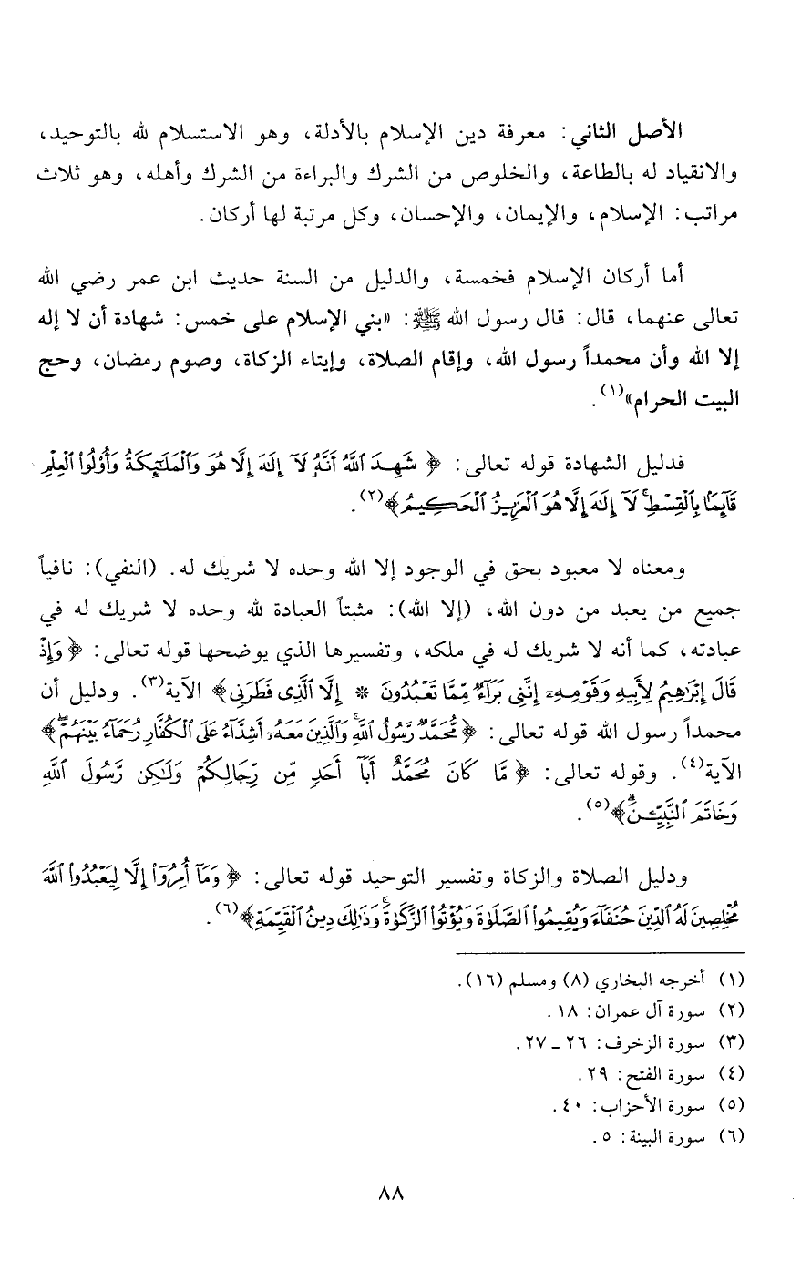 الأصل الثاني: معرفة دين الإسلام بالأدلة، وهو الاستسلام لله بالتوحيد، والانقياد له بالطاعة، والخلوص من الشرك والبراءة من الشرك وأهله، وهو ثلاث مراتب: الإسلام، والإيمان، والإحسان، وكل مرتبة لها أركان.