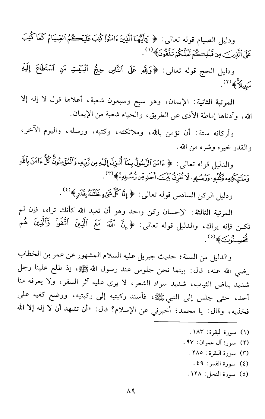 المرتبة الثانية: الإيمان، "وهو سبع وسبعون شعبة، أعلاها قول لا إله إلا الله، وأدناها إماطة الأذى عن الطريق، والحياء شعبة من الإيمان.