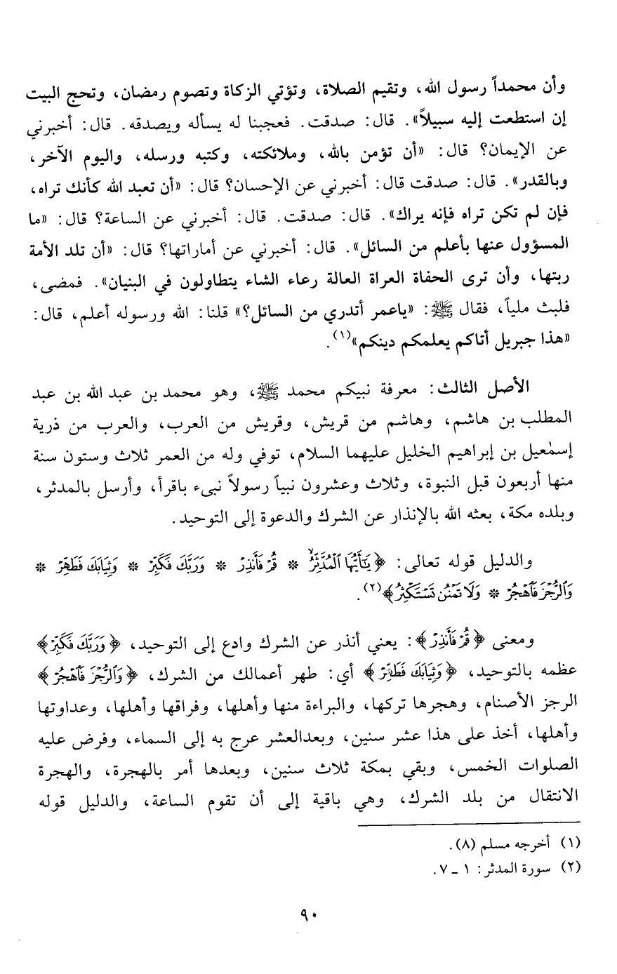 الأصل الثالث: معرفة نبيكم محمد صلى الله عليه وسلم، وهو محمد بن عبد الله بن عبد المطلب بن هاشم، وهاشم من قريش، وقريش من العرب، والعرب من ذرية إسماعيل بن إبراهيم الخليل عليهما السلام، توفي وله من العمر ثلاث وستون سنة منها أربعون قبل النبوة، وثلاث وعشرون نبياً رسولاً نبىء باقرأ، وأرسل بالمدثر، وبلده مكة، بعثه الله بالإنذار عن الشرك والدعوة إلى التوحيد.