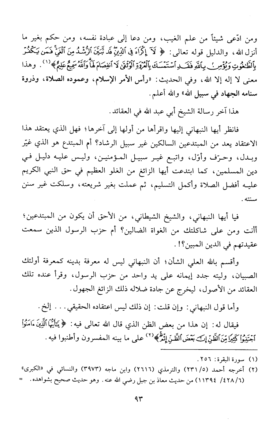 فانظر أيها النبهاني إليها واقرأها من أولها إلى آخرها؛ فهل الذي يعتقد هذا الاعتقاد يعد من المبتدعين السالكين غير سبيل الرشاد؟ أم المبتدع هو الذي غيّر وبدل، وحرّف وأوّل، واتبع غير سبيل المؤمنين، وليس عليه دليل في دين المسلمين، كما ابتدعت أيها الزائغ من الغلو العظيم في حق النبي الكريم عليه أفضل الصلاة وكمل التسليم، ثم عملت بغير شريعته، وسلكت غير سنن سنته.