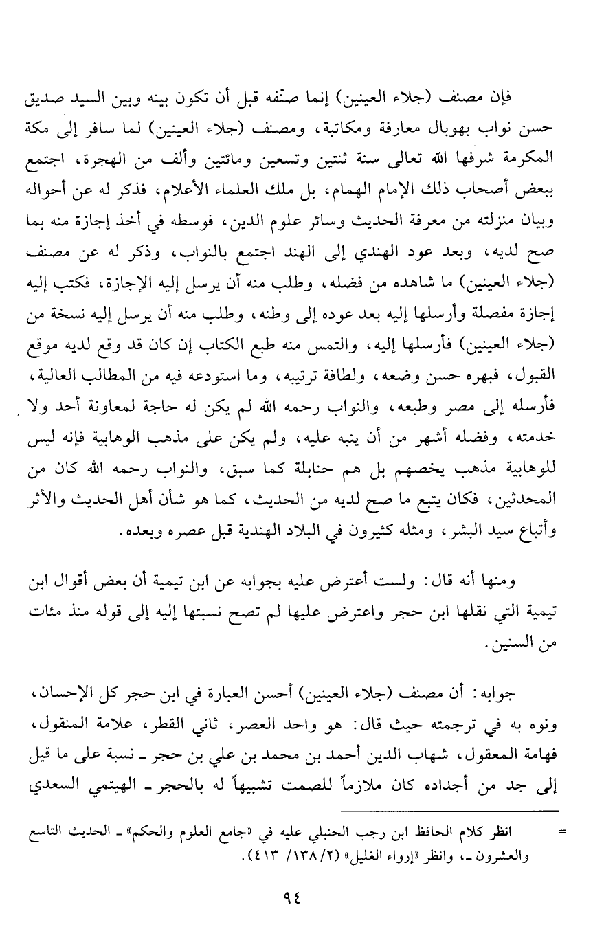 فإن مصنف "جلاء العينين" إنما صنّفه قبل أن تكون بينه وبين السيد صديق حسن نواب بهوبال معارفة ومكاتبة، ومصنف "جلاء العينين" لما سافر إلى مكة المكرمة شرفها الله تعالى سنة ثنتين وتسعين ومائتين وألف من الهجرة، اجتمع ببعض أصحاب ذلك الإمام الهمام، بل ملك العلماء الأعلام، فذكر له عن أحواله وبيان منزلته من معرفة الحديث وسائر علوم الدين، فوسطه في أخذ إجازة منه بما صح لديه، وبعد عود الهندي إلى الهند اجتمع بالنواب، وذكر له عن مصنف "جلاء العينين" ما شاهده من فضله، وطلب منه أن يرسل إليه الإجازة، فكتب إليه إجازة مفصلة وأرسلها إليه بعد عوده إلى وطنه، وطلب منه أن يرسل إليه نسخة من "جلاء العينين" فأرسلها إليه، والتمس منه طبع الكتاب إن كان قد وقع لديه موقع القبول، فبهره حسن وضعه، ولطافة ترتيبه، وما استودعه فيه من المطالب العالية، فأرسله إلى مصر وطبعه، والنواب رحمه الله لم يكن له حاجة لمعاونة أحد ولا خدمته، وفضله أشهر من أن ينبه عليه، ولم يكن على مذهب الوهابية فإنه ليس للوهابية مذهب يخصهم بل هم حنابلة كما سبق، والنواب رحمه الله كان من المحدثين، فكان يتبع ما صح لديه من الحديث، كما هو شأن أهل الحديث والأثر وأتباع سيد البشر، ومثله كثيرون في البلاد الهندية قبل عصره وبعده.