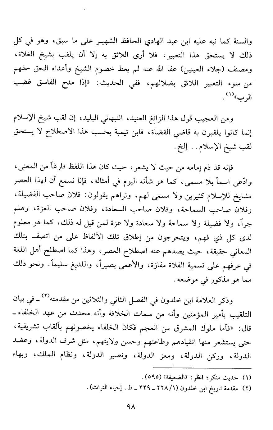 والسنة كما نبه عليه ابن عبد الهادي الحافظ الشهير على ما سبق، وهو في كل ذلك لا يستحق هذا التعبير، فلا أرى اللائق به إلا أن يلقب بشيخ الغلاة، ومصنف "جلاء العينين" عفا الله عنه لم يعط خصوم الشيخ وأعداء الحق حقهم من سوء التعبير اللائق بضلالهم، ففي الحديث: "إذا مدح الفاسق غضب الرب"1.