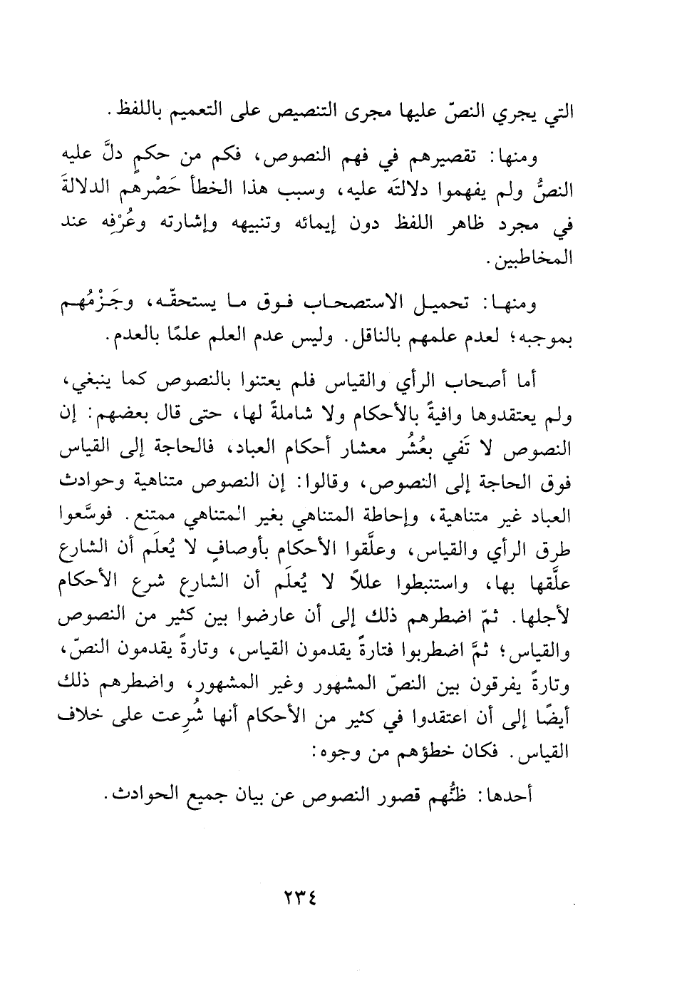 أما أصحاب الرأي والقياس فلم يعتنوا بالنصوص كما ينبغي، ولم يعتقدوها وافيةً بالأحكام ولا شاملةً لها، حتى قال بعضهم: إن النصوص لا تَفي بعُشُر معشار أحكام العباد، فالحاجة إلى القياس فوق الحاجة إلى النصوص، وقالوا: إن النصوص متناهية وحوادث العباد غير متناهية، وإحاطة المتناهي بغير المتناهي ممتنع. فوسَّعوا طرق الرأي والقياس، وعلَّقوا الأحكام بأوصافٍ لا يُعلَم أن الشارع علَّقها بها، واستنبطوا عللاً لا يُعلَم أن الشارم شرع الأحكام لأجلها. ثمّ اضطرهم ذلك إلى أن عارضوا بين كثير من النصوص والقياس؟ ثمَّ اضطربوا فتارةً يقدمون القياس، وتارةً يقدمون النصّ، وتارةً يفرقون بين النصّ المشهور وغير المشهور، واضطرهم ذلك أيضًا إلى أن اعتقدوا في كثير من الأحكام أنها شرِعت على خلاف القياس. فكان خطؤهم من وجوه: