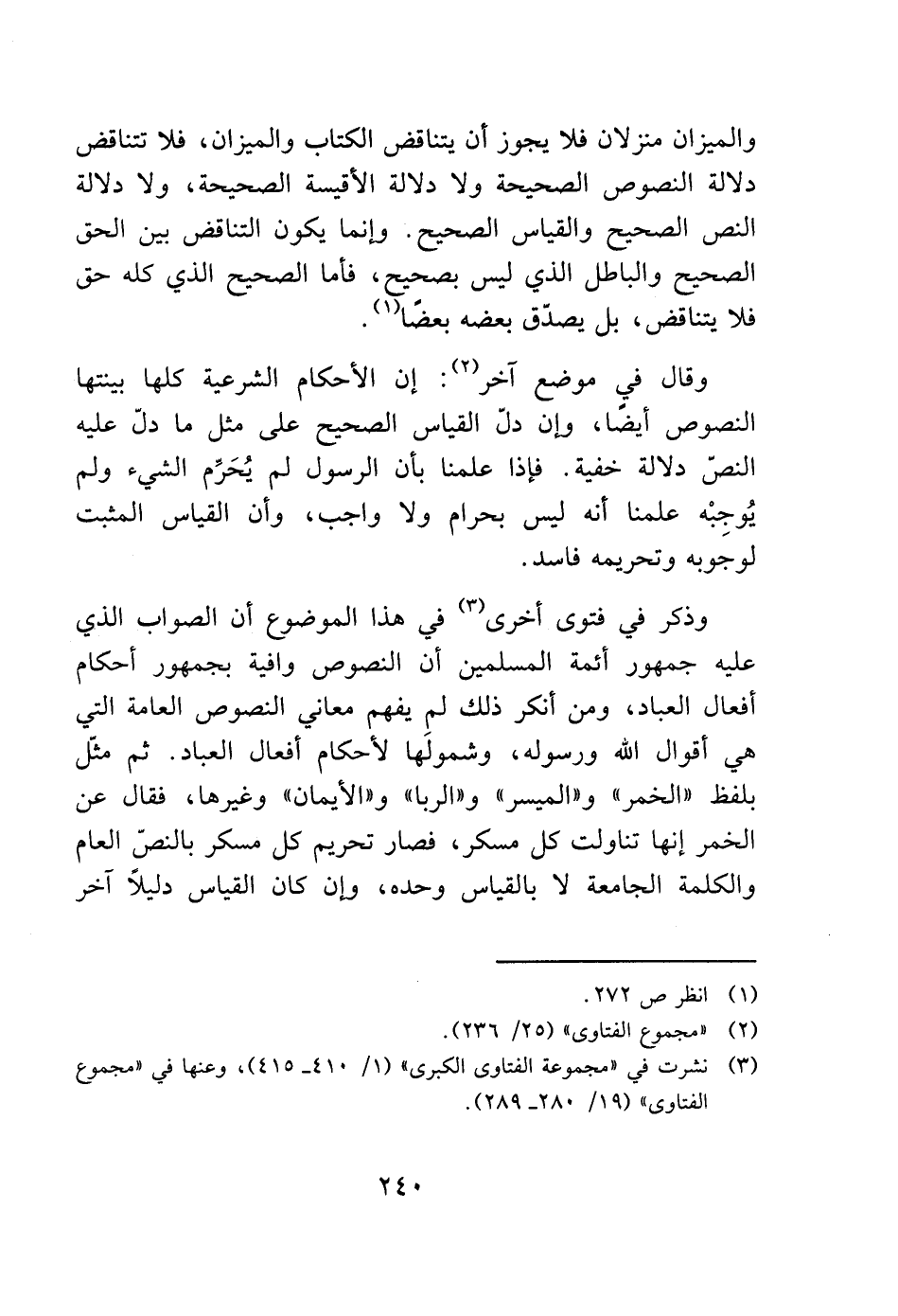 وذكر في فتوى أخرى (3) في هذا الموضوع أن الصواب الذي عليه جمهور أئمة المسلمين أن النصوص وافية بجمهور أحكام أفعال العباد، ومن أنكر ذلك لمِ يفهم معاني النصوص العامة التي هي أقوال الله ورسوله، وشمولها لأحكام أفعال العباد. ثم مثّل بلفظ "الخمر" و"الميسر" و"الربا" و"الأيمان" وغيرها، فقال عن الخمر إنها تناولت كل مسكر، فصار تحريم كل مسكر بالنصّ العام والكلمة الجامعة لا بالقياس وحده، وإن كان القياس دليلاً آخر