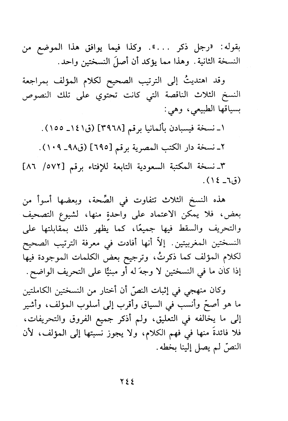 وكان منهجي في إثبات النصّ أن أختار من النسختين الكاملتين ما هو أصحّ وأنسب في السياق وأقرب إلى أسلوب المؤلف، وأشير إلى ما يخالفه في التعليق، ولم أذكر جميع الفروق والتحريفات، فلا فائدةَ منها في فهم الكلام، ولا يجوز نسبتها إلى المؤلف، لأن النصّ لم يصل إلينا بخطه.