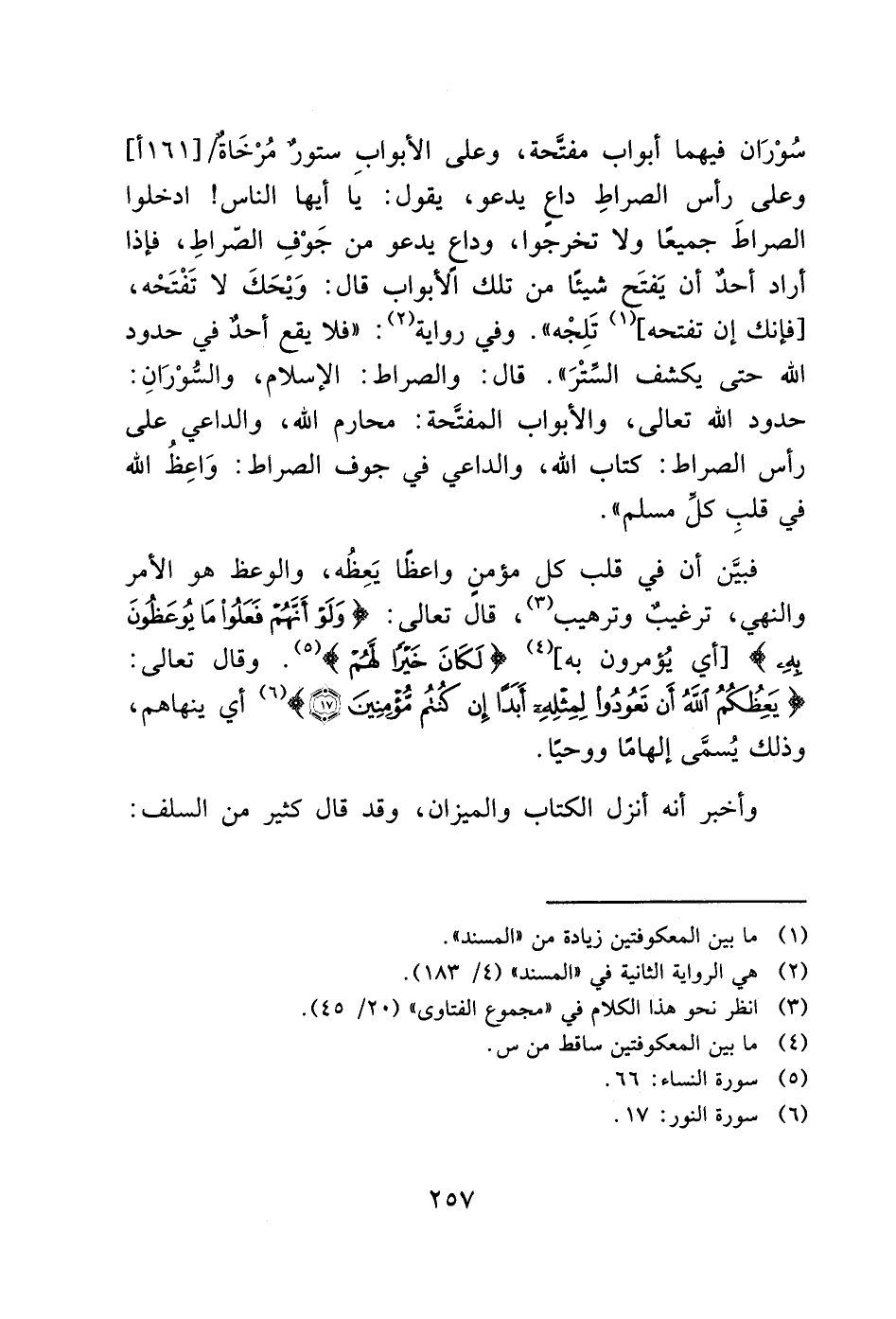 سُوْرَان فيهما أبواب مفتَّحة، وعلى الأبواب ستورٌ مُرْخَاة/ [161/أ]، وعلى رأس الصراطِ داع يدعو، يقول: يَا أيها الناس! ادخلوا الصراطَ جميعًا ولا تخرجًوا، وداع يدعو من جَوْفِ الصّراطِ، فإذا أراد أحدٌ أن يَفتَح شيئًا من تلك الأبواب قال: وَيْحَكَ لا تَفْتَحْه، [فإنك إن تفتحه] (1) تَلِجْه ". وفي رواية (2): "فلا يقع أحدٌ في حدود الله حتى يكشف الستْرَ". قال: والصراط: الإسلام، والسوْرَانِ: حدود الله تعالى، والأبواب المفتَحة: محارم الله، والداعي على رأس الصراط: كتاب الله، والداعي في جوف الصراط: وَاعِظُ الله في قلبِ كلِّ مسلم".