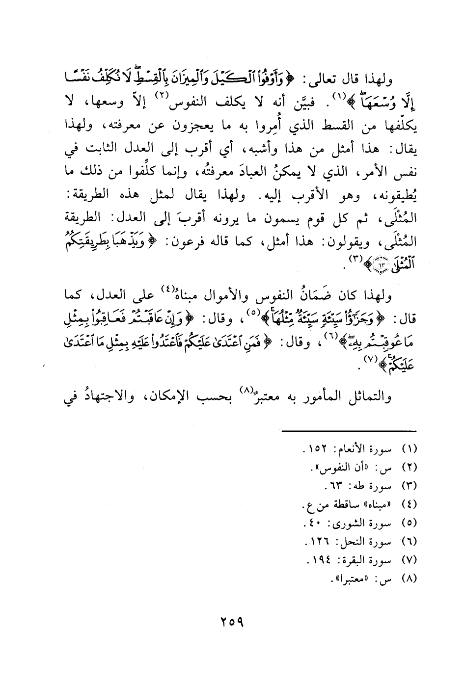 ولهذا كان ضَمَانُ النفوس والأموال مبناهُ (4) على العدل، كما قال: (وَجَزَاءُ سَيِّئَةٍ سَيِّئَةٌ مِثْلُهَا) (5)، وقال (وَإِنْ عَاقَبْتُمْ فَعَاقِبُوا بِمِثْلِ مَا عُوقِبْتُمْ بِهِ) (6)، وقال: (فَمَنِ اعْتَدَى عَلَيْكُمْ فَاعْتَدُوا عَلَيْهِ بِمِثْلِ مَا اعْتَدَى عَلَيْكُم) (7).