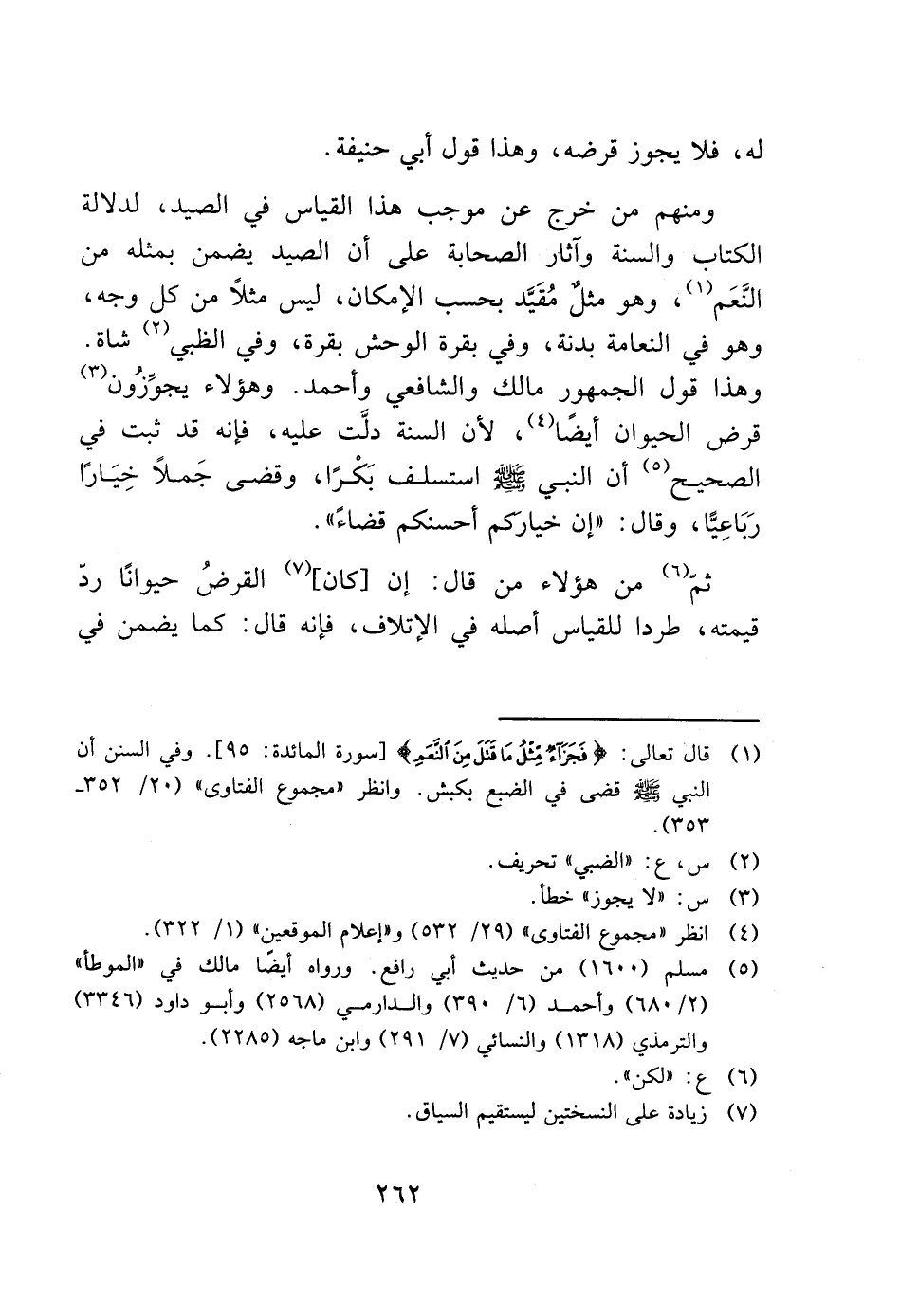 ومنهم من خرج عن موجب هذا القياس في الصيد، لدلالة الكتاب والسنة وآثار الصحابة على أن الصيد يضمن بمثله من النَّعَم (1)، وهو مثل مُقَيَّد بحسب الإمكان، ليس مثلاً من كل وجه، وهو في النعامة بدنة، وفي بقرة الوحش بقرة، وفي الظبي (2) شاة.
