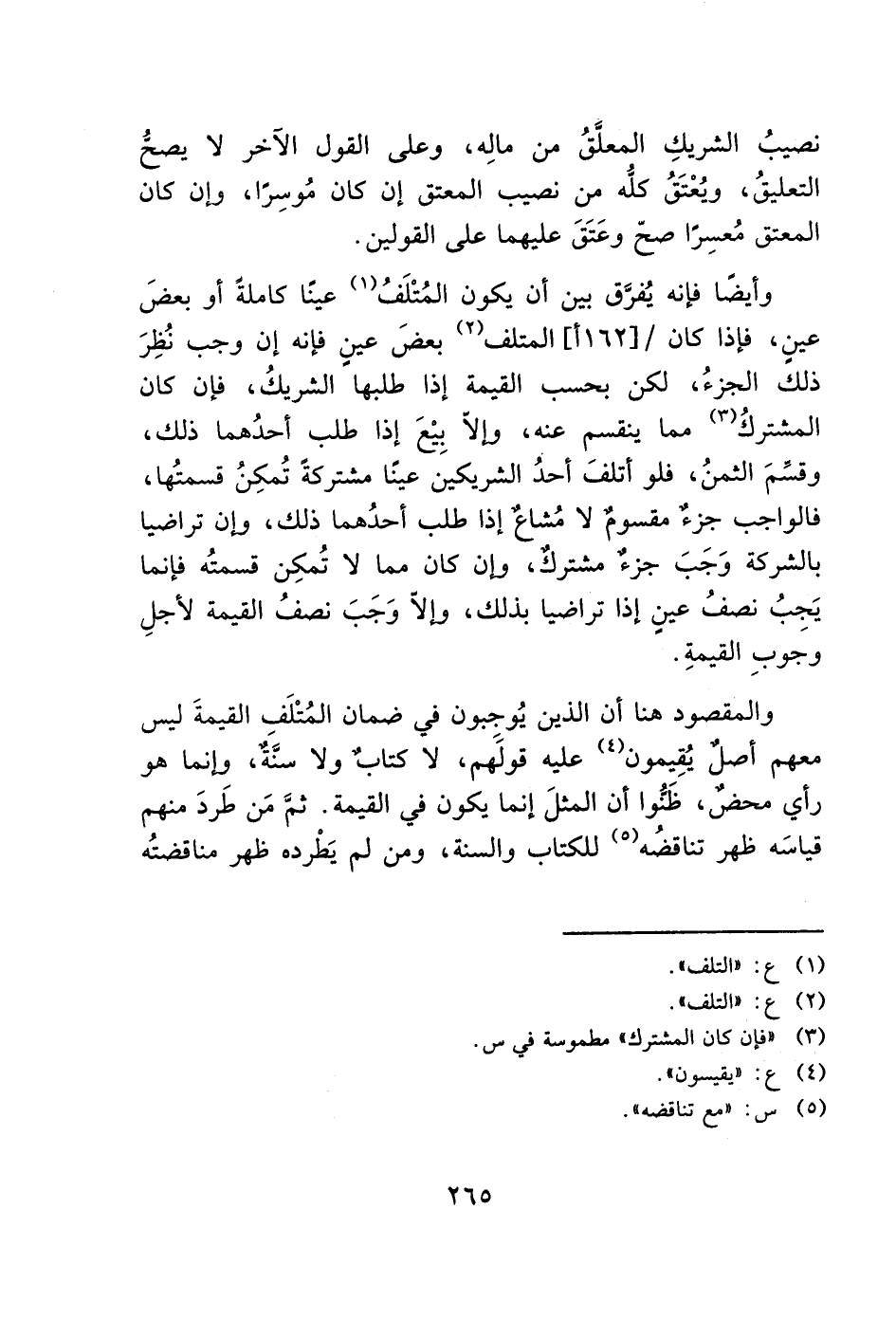 وأيضا فإنه يُفرَّق بين أن يكون المُتْلَفُ (1) عينَا كاملة أو بعضَ عينِ، فإذا كان/ [162 أ]، المتلف (2) بعضَ عينٍ فإنه إن وجب نُظِرَ ذلك الجزءُ، لكن بحسب القيمة إذا طلبها الشريكُ، فإن كان المشتركُ (3) مما ينقسم عنه، وإلّا بيْعَ إذا طلب أحدُهما ذلك، وقسمَ الثمنُ، فلو أتلفَ أحدُ الشريكينَ عينَا مشتركة تُمكِنُ قسمتُها، فالواجب جز مقسوم لا مُشاع إذا طلب أحدُهما ذلك، وإن تراضيا بالشركة وَجَبَ جزءٌ مشترك، وإن كان مما لا تُمكِن قسمتُه فإنما يَجِبُ نصفُ عينٍ إذا تراضيا بذلك، وإلّا وَجَبَ نصفُ القيمة لأجلِ وجوبِ القيمةِ.