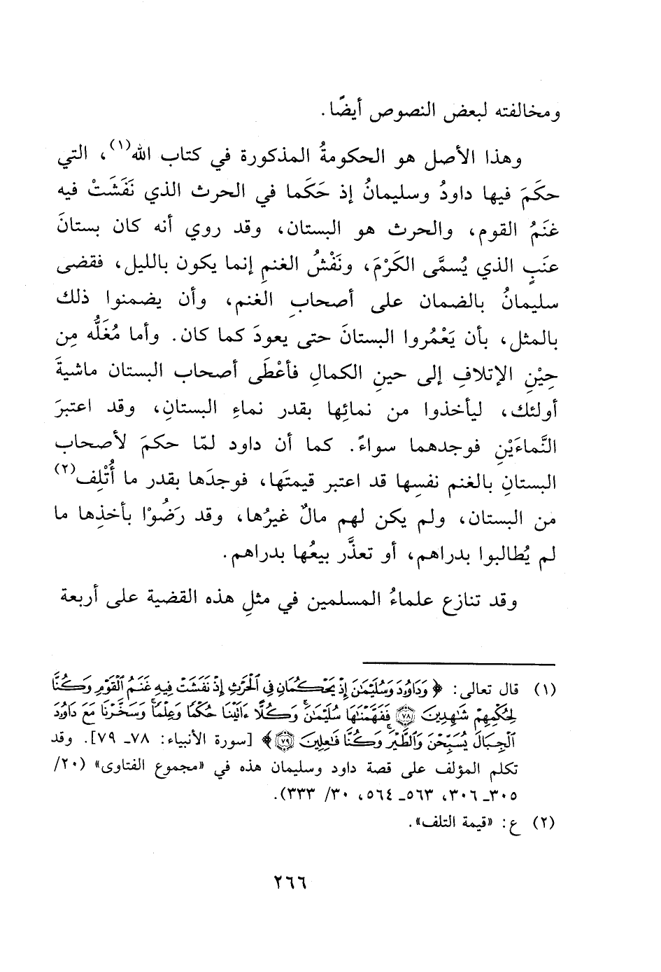 (1) قال تعالى: (وَدَاوُودَ وَسُلَيْمَانَ إِذْ يَحْكُمَانِ فِي الْحَرْثِ إِذْ نَفَشَتْ فِيهِ غَنَمُ الْقَوْمِ وَكُنَّا لِحُكْمِهِمْ شَاهِدِينَ (78) فَفَهَّمْنَاهَا سُلَيْمَانَ وَكُلًّا آَتَيْنَا حُكْمًا وَعِلْمًا وَسَخَّرْنَا مَعَ دَاوُودَ الْجِبَالَ يُسَبِّحْنَ وَالطَّيْرَ وَكُنَّا فَاعِلِينَ) [سورة الأنبياء: 78 - 79]. وقد تكلم المؤلف على قصة داود وسليمان هذه في "مجموع الفتاوى" (20/ 305 - 306، 563 - 564، 30/ 333).