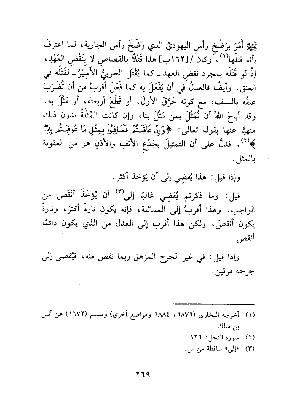 - صَلَّى اللَّهُ عَلَيْهِ وَسَلَّمَ - أَمَرَ برَضْخِ رأسِ اليهوديِّ الذي رَضَخَ رأس الجارية، لما اعترفَ بأنه قتلَها (1)، وكان/ [162 ب] هذا قَتْلاً بالقصاصِ لا بِنَقْضِ العَهْدِ، إذْ لو قَتَلَه بمجرد نقضِ العهد- كما يُقْتَل الحربيُّ الأسِيْرُ- لقَتَلَه في العنق. وأيضًا فالعدلُ في أن يُفْعَلَ به كما فَعَلَ أقربُ من أن تُضْرَبَ عنقُه بالسيف، مع كونه حَرَّقَ الأولَ، أو قَطَعَ أربعتَه، أو مَثلً به.