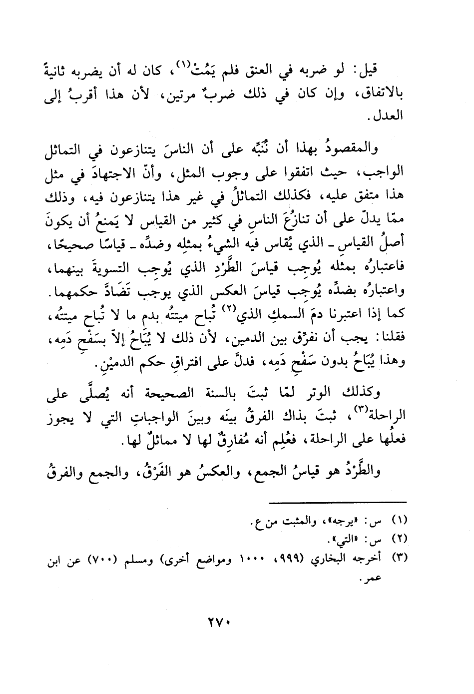 كما إذا اعتبرنا دم السمكِ الذي (2) تُباح ميتتُه بدمِ ما لا تُباح ميتتُه، فقلنا: يجب أن نفرَق بين الدمين، لأن ذلك لا يُبَاحُ إلاّ بسَفْحِ دَمِه، وهذا يُبَاحُ بدون سَفْحِ دَمِه، فدل على افتراقِ حكم الدميْنِ.