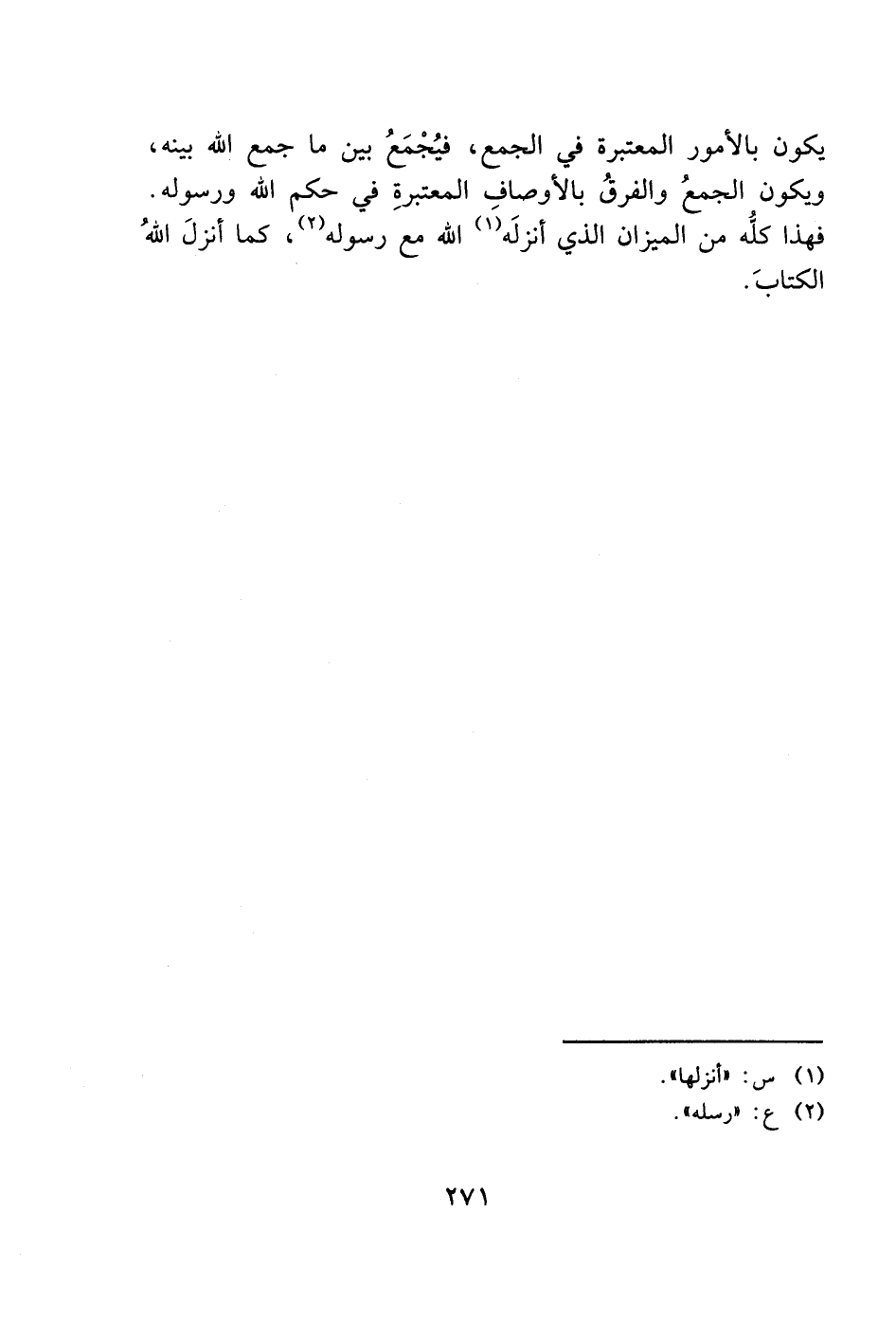 يكون بالأمور المعتبرة في الجمع، فيُجْمَعُ بين ما جمع الله بينه، ويكون الجمعُ والفرقُ بالأوصافِ المعتبرةِ في حكم الله ورسوله. فهذا كفُه من الميزان الذي أنزلَه (1) الله مع رسوله (2)، كما أنزلَ اللهُ الكتابَ.