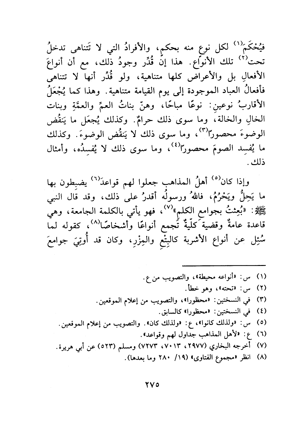 فيُحْكَمَ (1) لكل نوع منه بحكيم، والأفرادُ التي لا تَتناهى تدخلُ تحت (2) تلك الأنواع. هذا إن قُذَر وجودُ ذلك، مع أن أنواعَ الأفعالِ بل والأعراض كلها متناهية، ولو قُذَر أنها لا تتناهى فأفعالُ العباد الموجودة إلى يوم القيامة متناهية. وهذا كما يُجْعَلُ الأقاربُ نوعينِ: نوعَا مباحًا، وهن بناتُ العمَ والعمَّةِ وبنات الخالِ والخالة، وما سوى ذلك حرامٌ. وكذلك يُجعَل ما يَنقُض الوضوءَ محصورًا (3)، وما سوى ذلك لا يَنقُض الوضوءَ. وكذلك ما يُفسِد الصومَ محصورًا (4)، وما سوى ذلك لا يُفسِدُه، وأمثال ذلك.