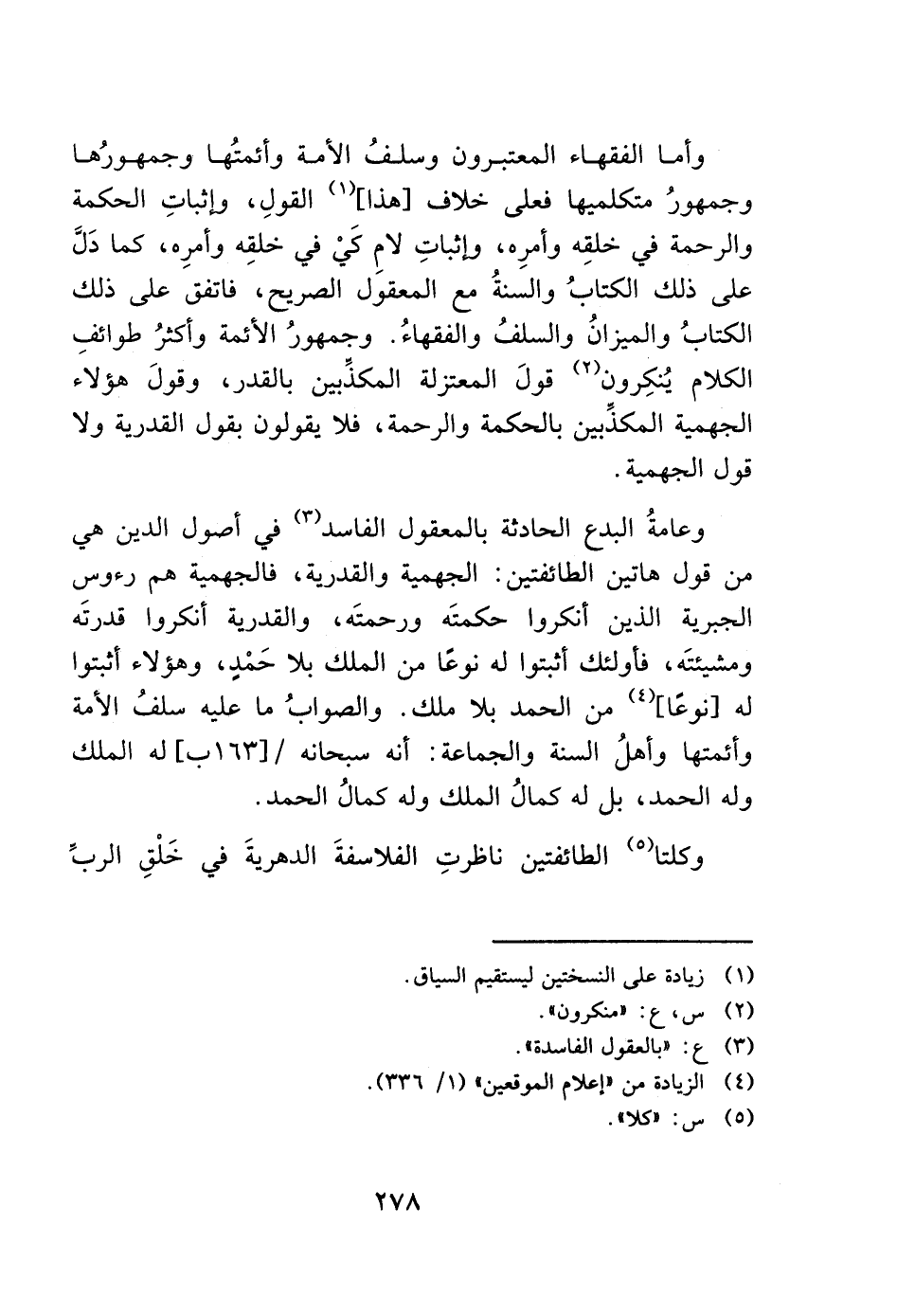 وأما الفقهاء المعتبرون وسلفُ الأمة وأئمتُها وجمهورُها وجمهورُ متكلميها فعلى خلاف [هذا] (1) القولِ، وإثباتِ الحكمة والرحمة في خلقِه وأمرِه، وإثباتِ لامِ كَيْ في خلقِه وأمرِه، كما دَلَّ على ذلك الكتابُ والسنةُ مع المعقول الصريح، فاتفق على ذلك الكتابُ والميزانُ والسلفُ والفقهاءُ. وجمهورُ الأئمة وأكثرُ طوائفِ الكلام يُنكِرون (2) قولَ المعتزلة المكذبين بالقدر، وقولَ هؤلاء الجهمية المكذبين بالحكمة والرحمة، فلا يقولون بقول القدرية ولا قول الجهمية.