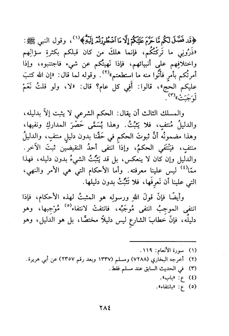 "ذرُوني ما تَركْتكم، فإنما هلكَ من كان قبلكم بكثرةِ سؤالهم واختلافِهم على أنبيائهم، فإذا نَهيتكم عن شيء فاجتنبوه، وإذا أمرتكم بأمرٍ فأتوا منه ما استطعتم" (2). وقوله لما قال: "إن الله كتبَ عليكم الحج"، قالوا: أَفِي كل عام؟ قال: "لا، ولو قلتُ نَعَمْ لَوَجَبَتْ" (3).