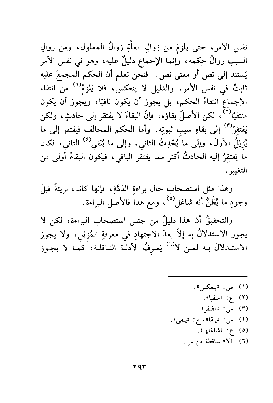 نفس الأمر، حتى يلزمَ من زوالِ العلَّة زوالُ المعلول، ومن زوالِ السبب زوالُ حكمه، وإنما الإجماع دليل عليه، وهو في نفس الأمر يَستند إلى نص أو معنى نص. فنحن نعلم أن الحكم المجمعَ عليه ثابتٌ في نفس الأمر، والدليل لا ينعكس، فلا يَلزمُ (1) من انتفاء الإجماع انتفاءُ الحكم، بل يجوز أن يكون نافيًا، ويجوز أن يكون منتفيًا (2)، لكن الأصلَ بقاؤه، فإن البقاءَ لا يفتقر إلى حادث، ولكن يَفتقِرُ (3) إلى بقاءِ سببِ ثبوته. وأما الحكم المخالف فيفتقر إلى ما يُزِيْلُ الأولَ، وإلى ما يُحْدِثُ الثاني، وإلى ما يُبْقي (4) الثاني، فكان ما يَفتقِرُ إليه الحادثُ أكثر مما يفتقر الباقي، فيكون البقاءُ أولى من التغيير.