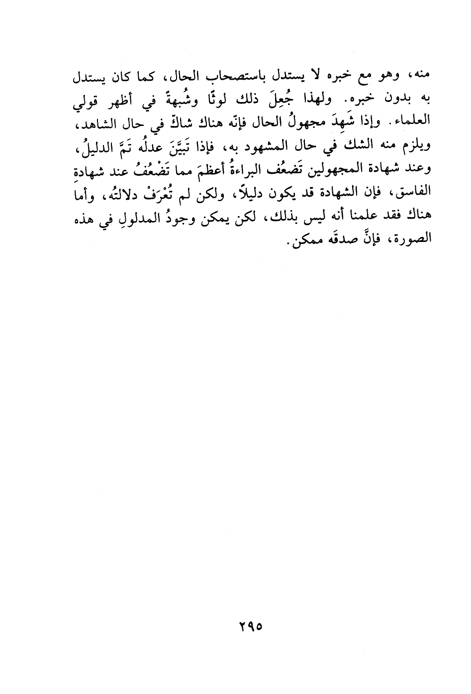 منه، وهو مع خبره لا يستدل باستصحاب الحال، كما كان يستدل به بدون خبره. ولهذا جُعِلَ ذلك لوثًا وشُبهة في أظهر قولي العلماء. وإذا شَهِدَ مجهولُ الحال فإنه هناك شاك في حال الشاهد، ويلزم منه الشك في حال المشهود به، فإذا تَبيَّنَ عدلُه تَمَّ الدليلُ، وعند شهادة المجهولين تَضعُف البراءةُ أعظمَ مما تَضْعُفُ عند شهادةِ الفاسق، فإن الشهادة قد يكون دليلاً، ولكن لم تُعْرَفْ دلالتُه، وأما هناك فقد علمنا أنه ليس بذلك، لكن يمكن وجودُ المدلولِ في هذه الصورة، فإنَّ صدقَه ممكن.
