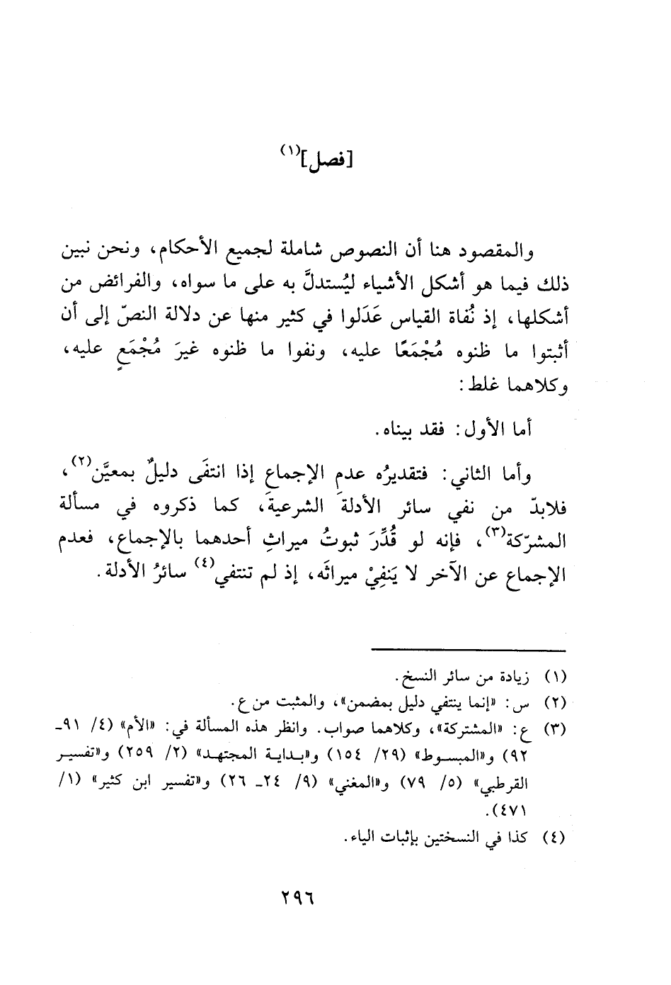 والمقصود هنا أن النصوص شاملة لجميع الأحكام، ونحن نبين ذلك فيما هو أشكل الأشياء ليُستدل به على ما سواه، والفرائض من أشكلها، إذ نُفاة القياس عَدَلوا في كثير منها عن دلالة النصّ إلى أن أثبتوا ما ظنوه مُجْمَعًا عليه، ونفوا ما ظنوه غيرَ مُجْمَعٍ عليه، وكلاهما غلط: