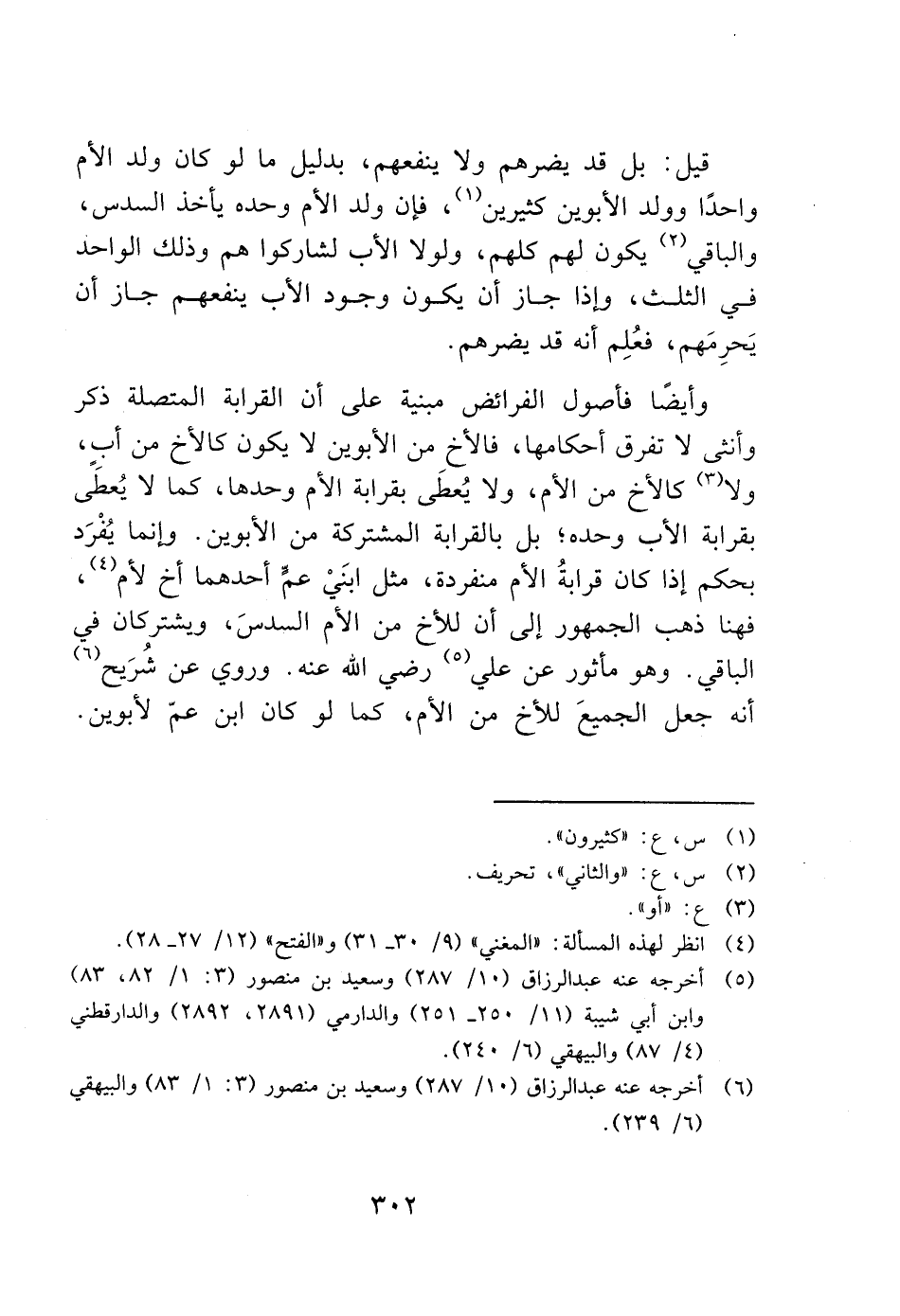 وأيضًا فأصول الفرائض مبنية على أن القرابة المتصلة ذكر وأنثى لا تفرق أحكامها، فالأخ من الأبوين لا يكون كالأخ من أب، ولا (3) كالأخ من الأم، ولا يُعطَى بقرابة الأم وحدها، كما لا يُعطًى بقرابة الأب وحده؛ بل بالقرابة المشتركة من الأبوين. وإنما يُفْرَد بحكم إذا كان قرابةُ الأم منفردة، مثل ابنَيْ عمًّ أحدهما أخ لأم (4)، فهنا ذهب الجمهور إلى أن للأخ من الأم السدسَ، ويشتركان في الباقي. وهو مأثور عن علي (5) رضي الله عنه. وروي عن شُرَيح (6) أنه جعل الجميعَ للأخ من الأم، كما لو كان ابن عمّ لأبوين.