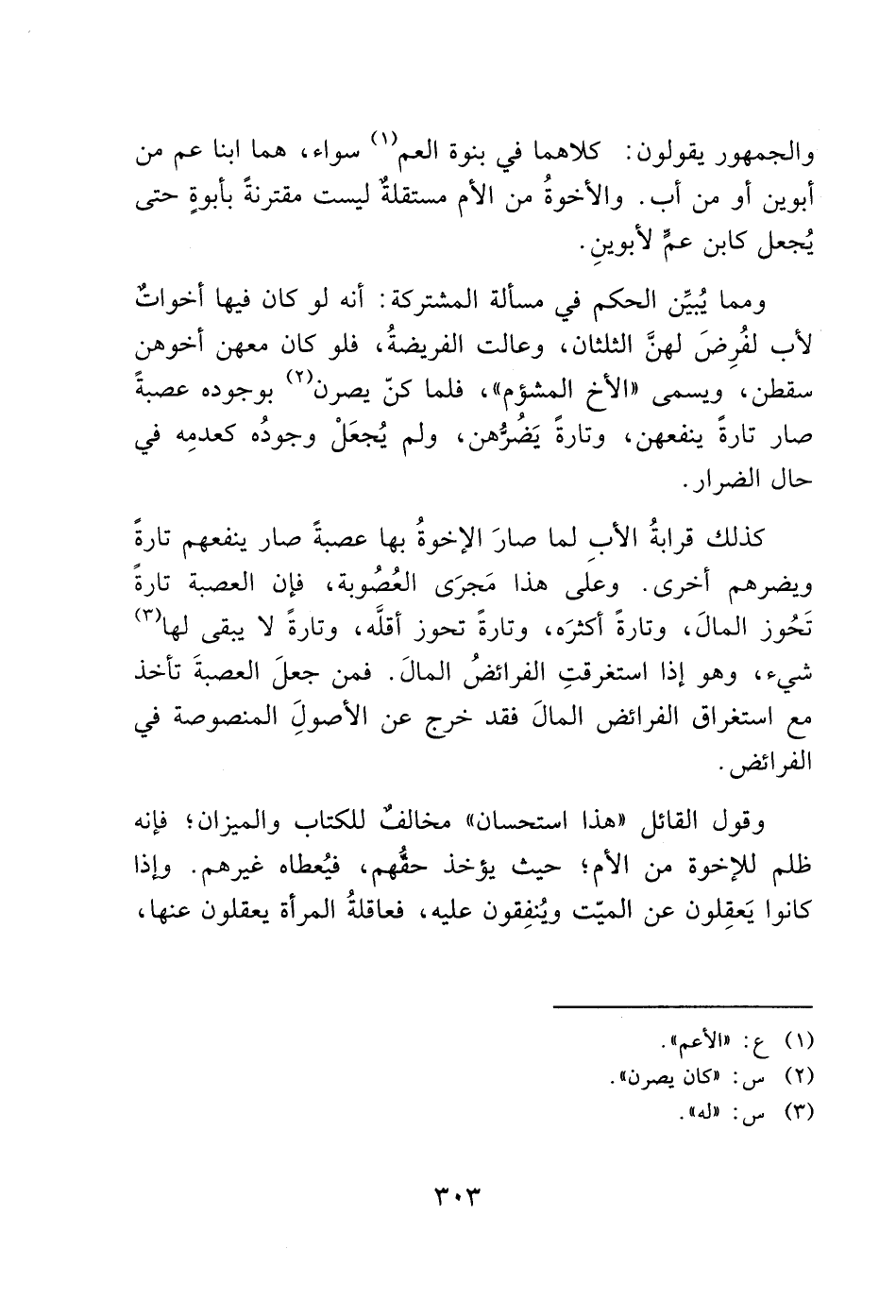 كذلك قرابةُ الأب لما صارَ الإخوةُ بها عصبةً صار ينفعهم تارةً ويضرهم أخرى. وعَلى هذا مَجرَى العُصوبة، فإن العصبة تارةً تَحُوز المالَ، وتارةً أكثرَه، وتارةً تحوز أقلَّه، وتارةً لا يبقى لها (3) شيء، وهو إذا استغرقتِ الفرائضُ المالَ. فمن جعلَ العصبةَ تأخذ مع استغراق الفرائض المالَ فقد خرج عن الأصولِ المنصوصة في الفرائض.