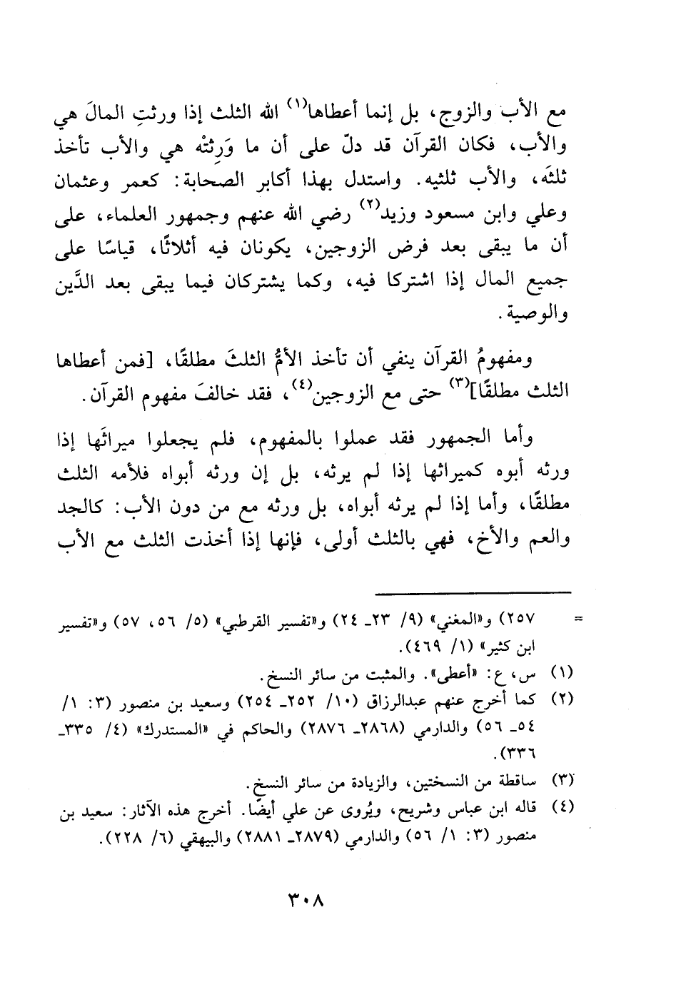 ومفهومُ القرآن ينفي أن تأخذ الأمُّ الثلثَ مطلقا، [فمن أعطاها الثلث مطلقًا] (3) حتى مع الزوجين (4)، فقد خالفَ مفهوم القرآن. وأما الجمهور فقد عملوا بالمفهوم، فلم يجعلوا ميراثَها إذا ورثه أبوه كميراثها إذا لم يرثه، بل إن ورثه أبواه فلأمه الثلث مطلقًا، وأما إذا لم يرثه أبواه، بل ورثه مع من دون الأب: كالجد والعم والأخ، فهي بالثلث أولى، فإنها إذا أخذت الثلث مع الأب