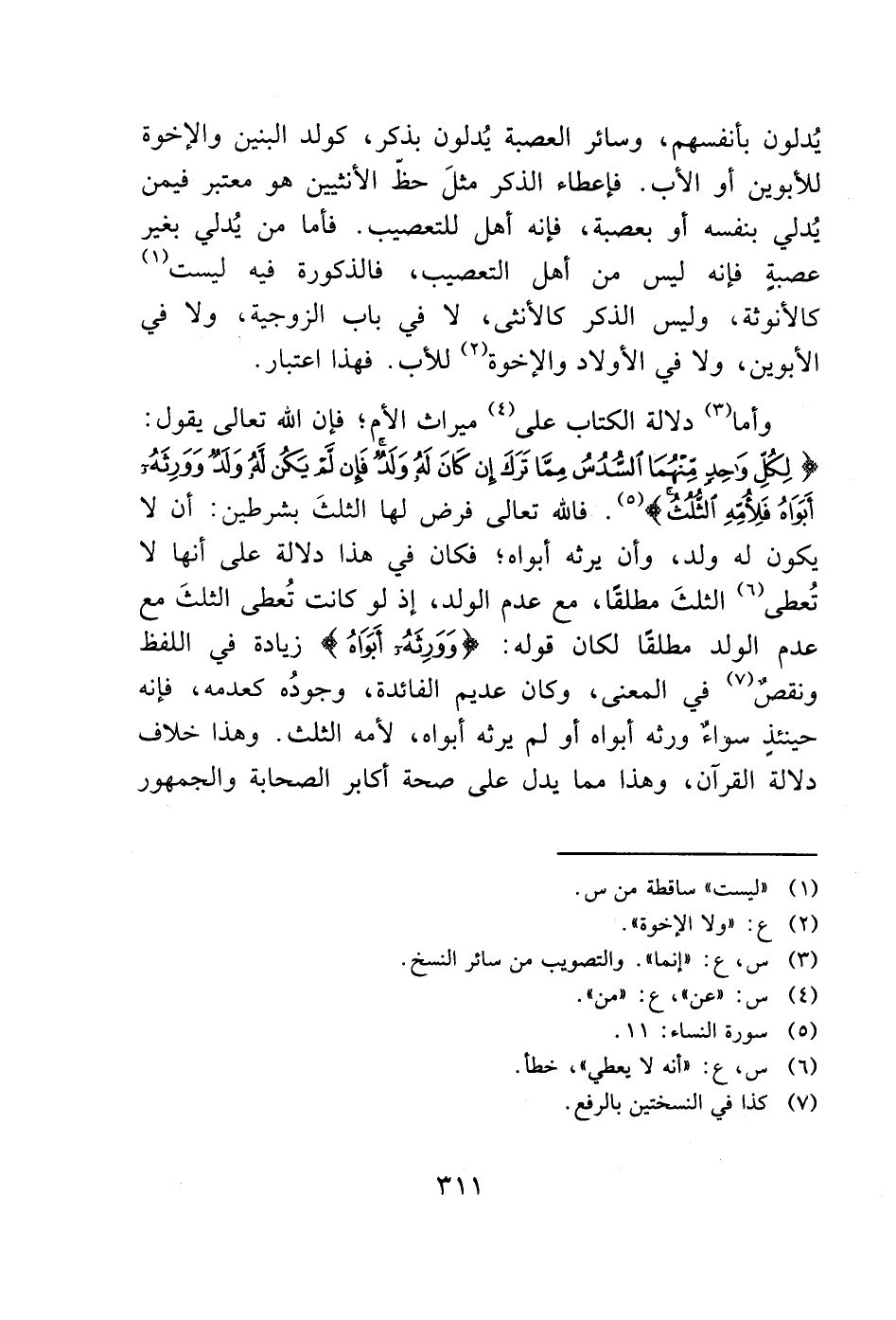 يُدلون بأنفسهم، وسائر العصبة يُدلون بذكر، كولد البنين والإخوة للأبوين أو الأب. فإعطاء الذكر مثلَ حظّ الأنثيين هو معتبر فيمن يُدلي بنفسه أو بعصبة، فإنه أهل للتعصيب. فأما من يُدلي بغير عصبةٍ فإنه ليس من أهل التعصيب، فالذكورة فيه ليست (1) كالأنوثة، وليس الذكر كالأنثى، لا في باب الزوجية، ولا في الأبوين، ولا في الأولاد والإخوة (2) للأب. فهذا اعتبار.